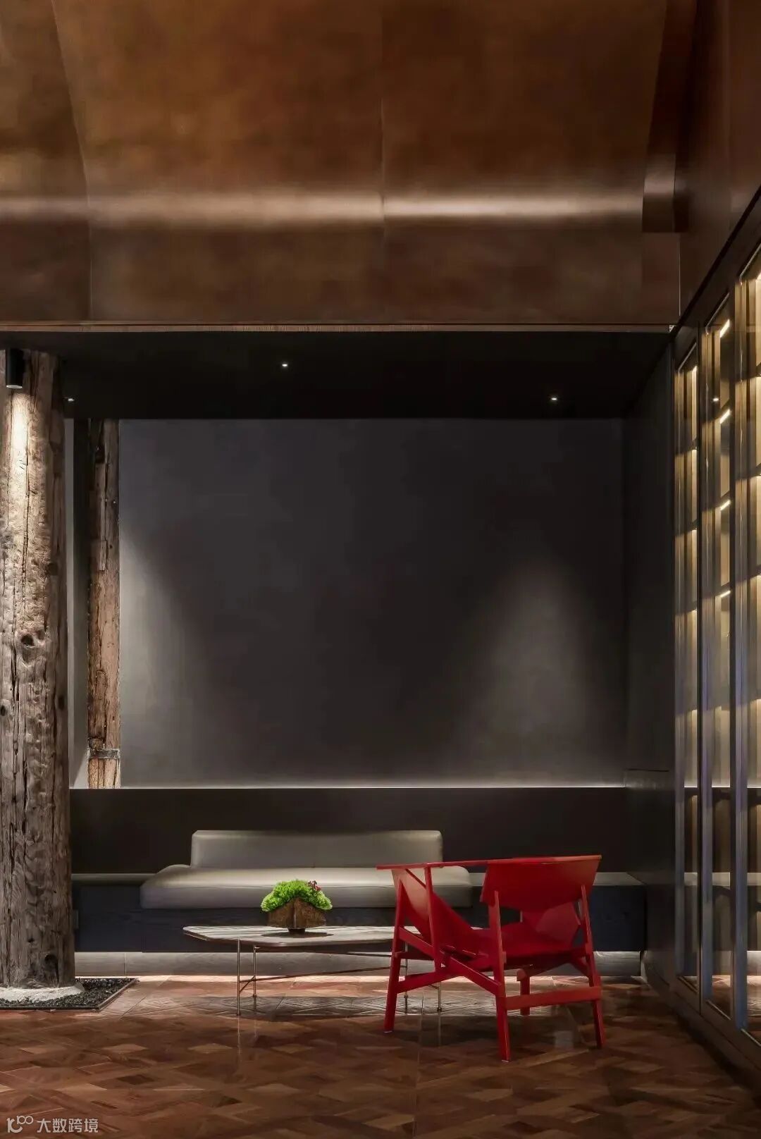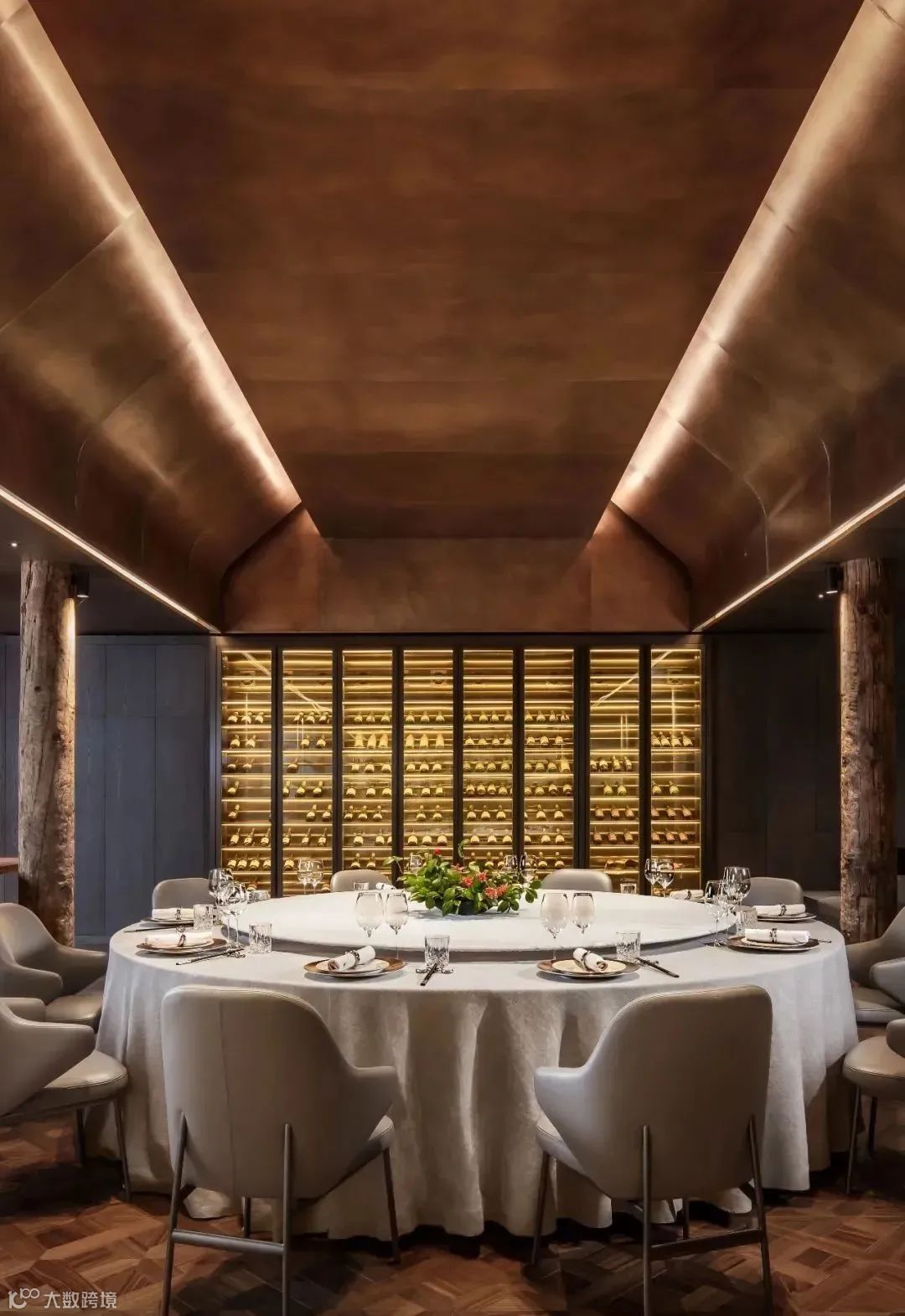备餐区也作为吧台存在,吧台后部区域分设酒柜,也间接充当正式餐区与公共区的隔断。两侧等待区采用对称格局,中部场地为客人完全留出。