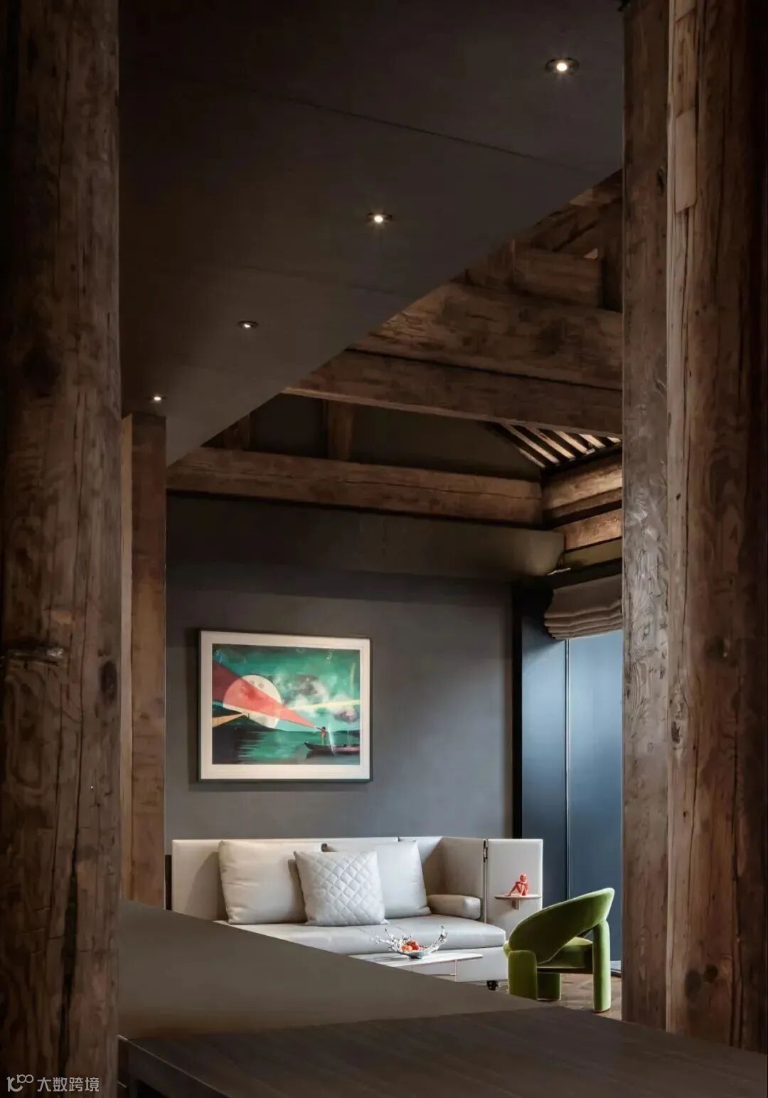 灰色砖墙与布满刮痕、磨损的原木廊柱向人们展示光阴在房子中游转的痕迹,角落处的老树数十年如一日庇护着这处院落,枝干轻柔搭在尖角屋顶,茂盛生长的叶片“爬上高处”静静俯瞰着周围的院落与房屋。