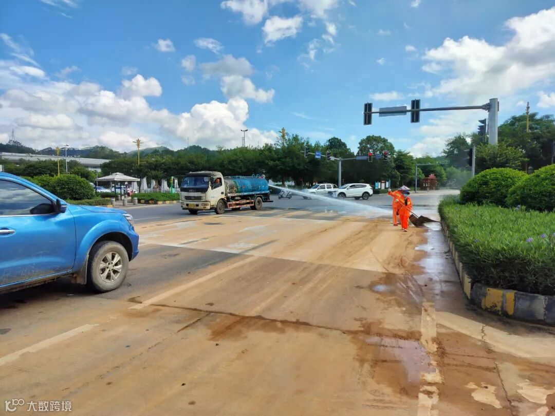 冲洗洪水后流出大量泥巴及路面车辆漏出油漆