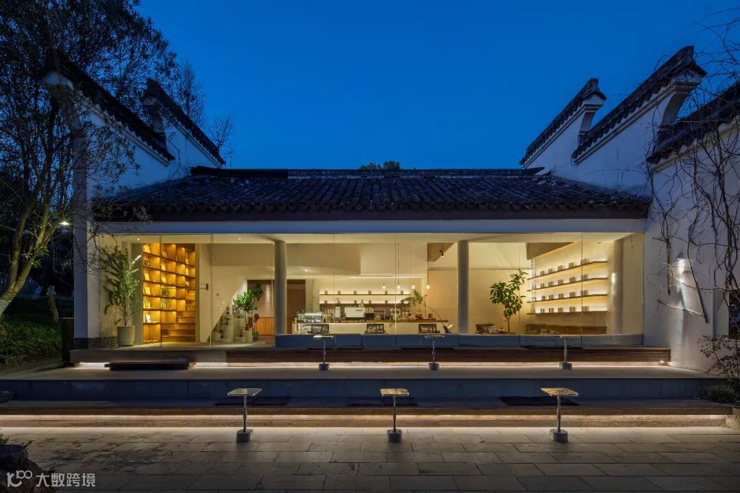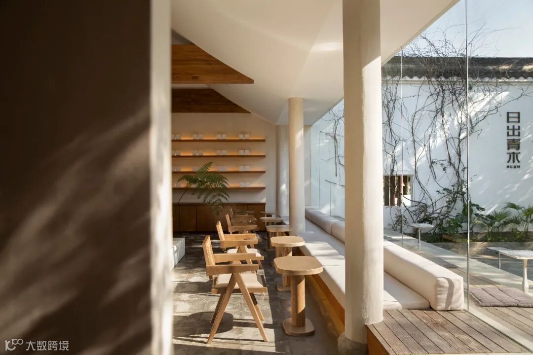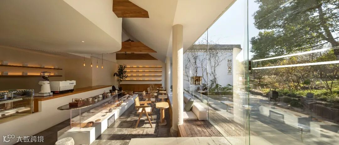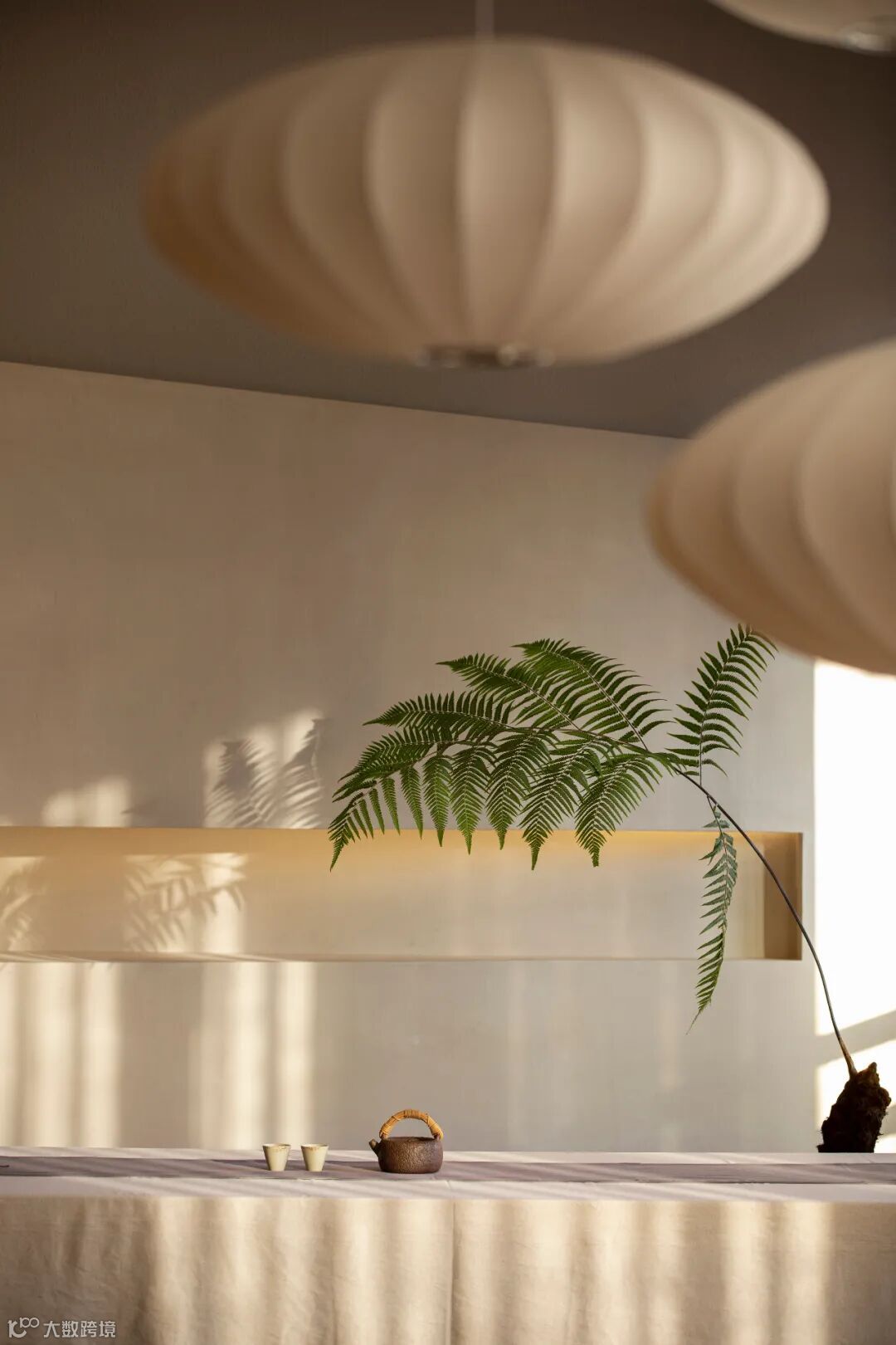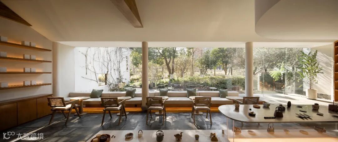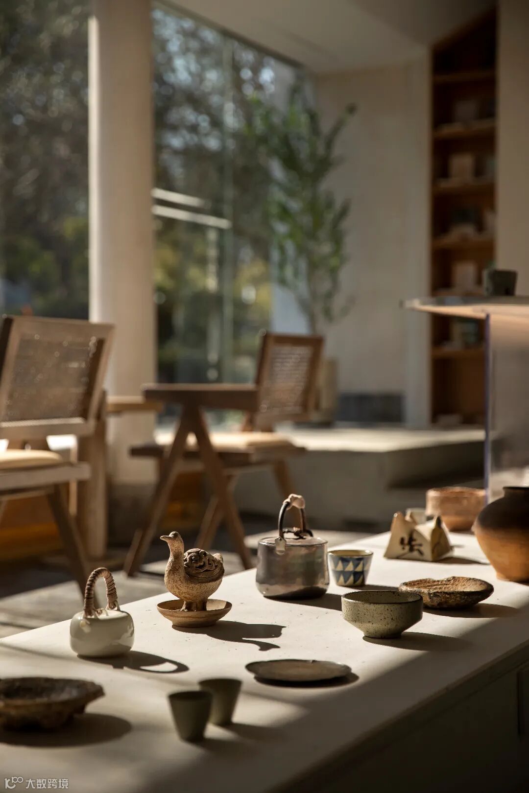 布置,中部展台放置茶器与陶器等工艺品,而靠近玻璃处则是长条形卡座,望向远处的景色,实现了空间的层层递进。