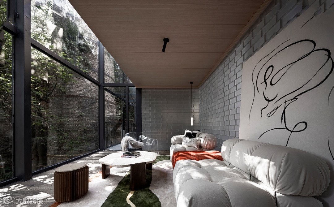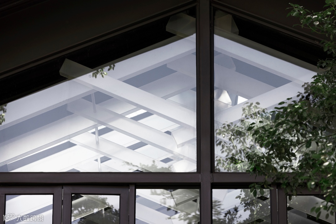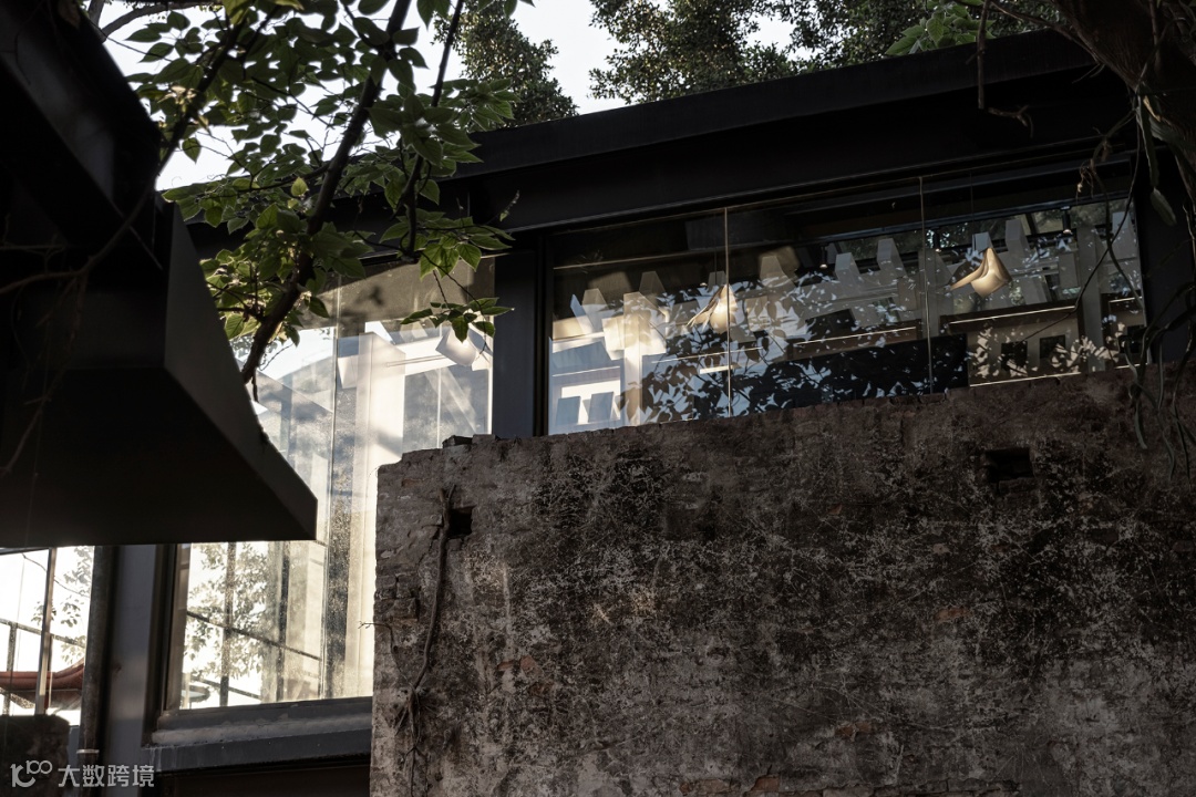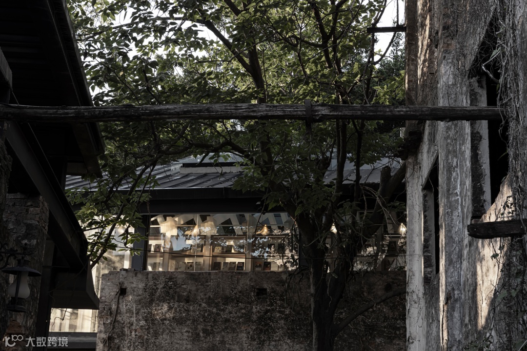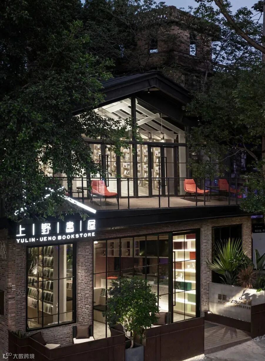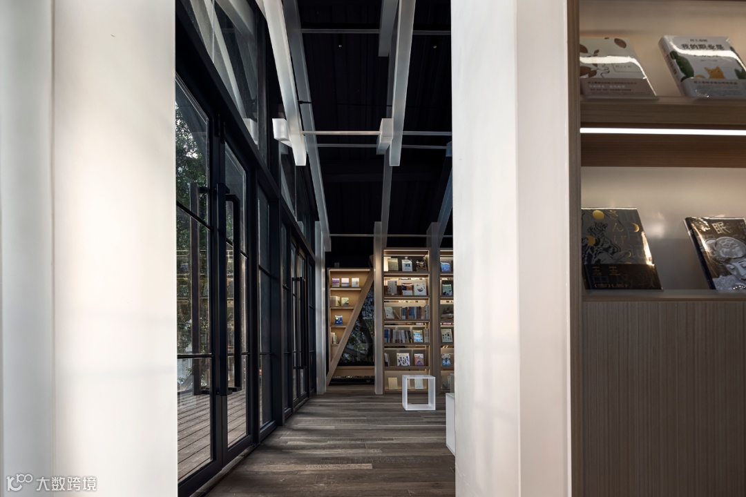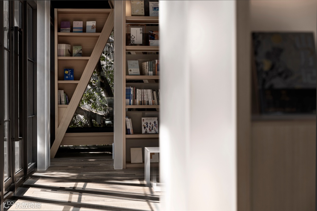 上野书屋整体建筑环境属于半遮挡的状态,室内与室外任意联通,一扇门一扇窗,开合之间,四时风景静静划过,坐在院子里、露台上,看婆娑树影斜射在斑驳墙面,影子随着光线变换成任意形状,风吹过书的扉页,摩擦出轻柔的沙沙声,有时细雨,却丝毫不影响好心情,从白天到入夜,每一个时刻都不忍惊扰。