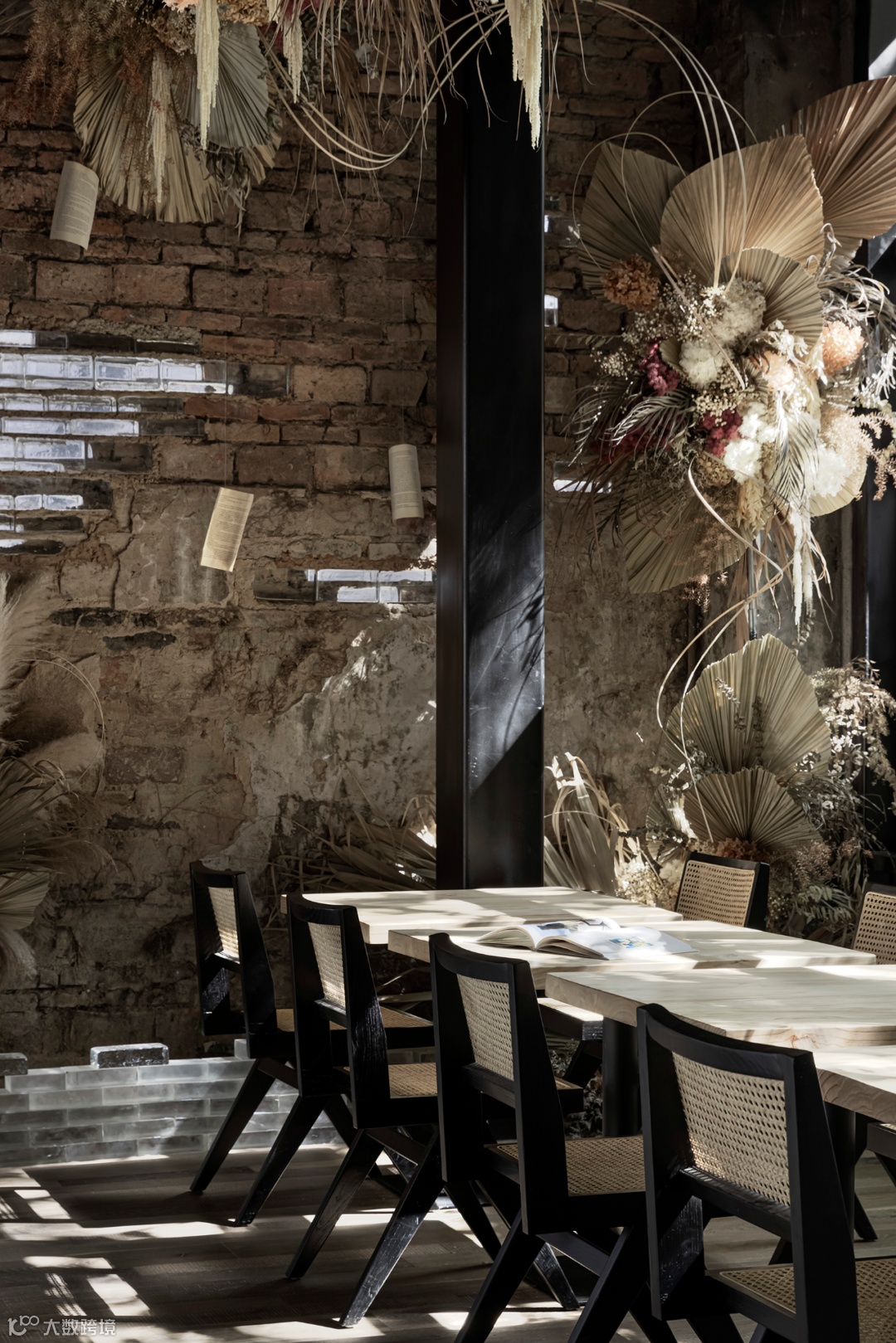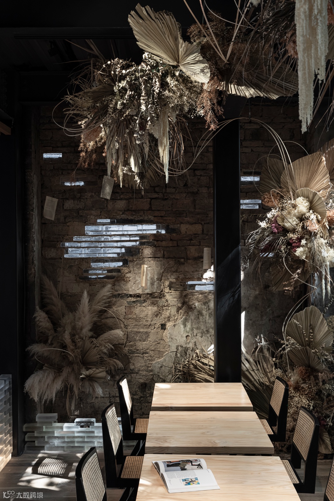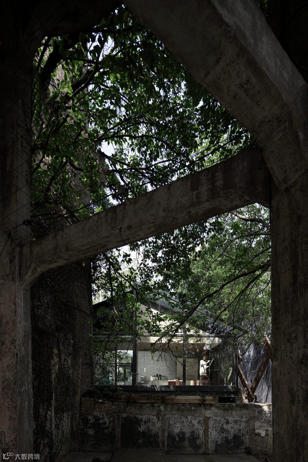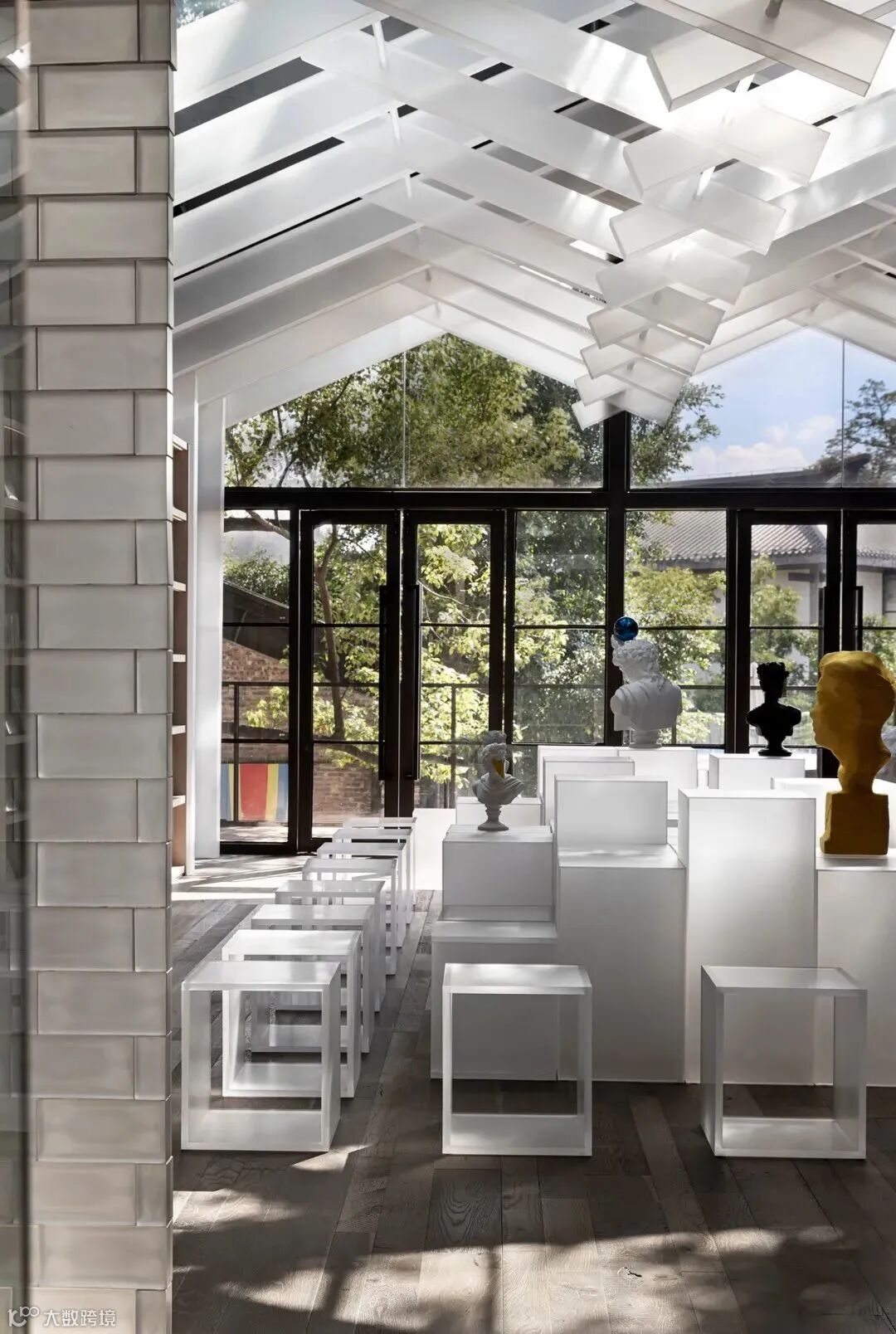 上野书屋整体建筑环境属于半遮挡的状态,室内与室外任意联通,一扇门一扇窗,开合之间,四时风景静静划过,坐在院子里、露台上,看婆娑树影斜射在斑驳墙面,影子随着光线变换成任意形状,风吹过书的扉页,摩擦出轻柔的沙沙声,有时细雨,却丝毫不影响好心情,从白天到入夜,每一个时刻都不忍惊扰。