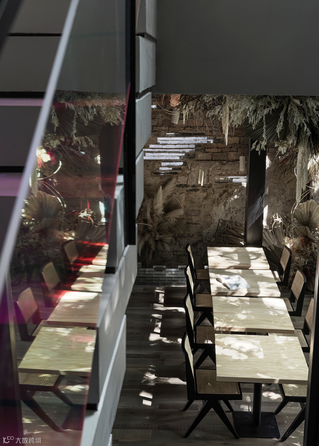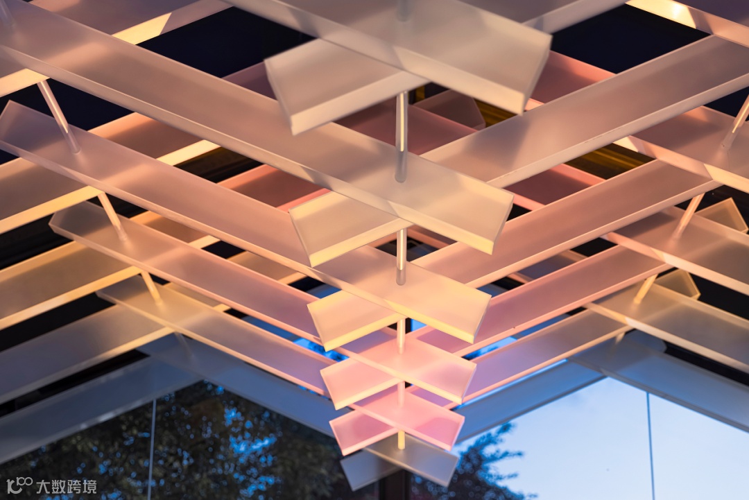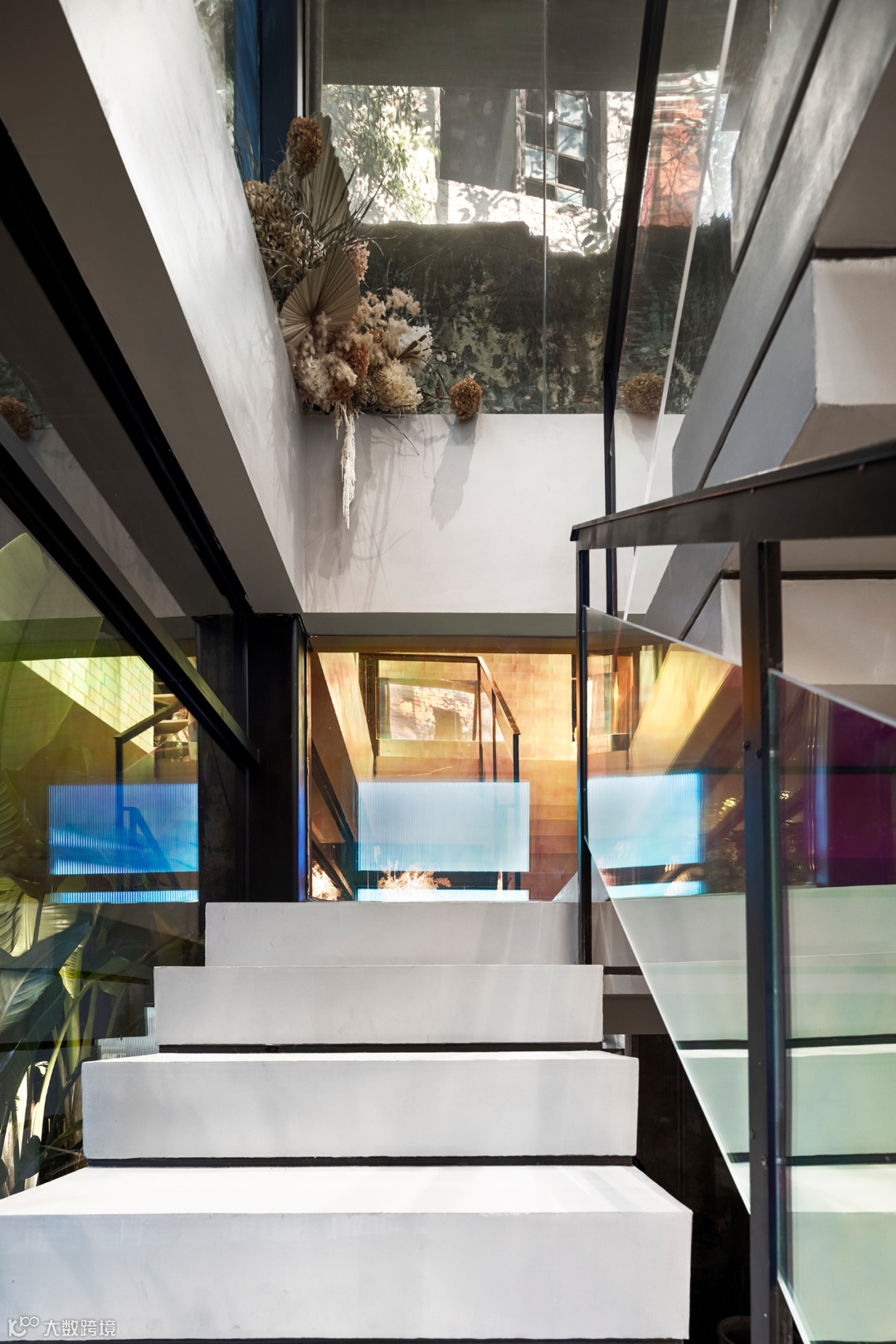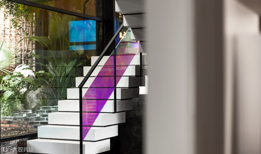 空间的转换带来心境的转变,通过现代手法呈现的楼梯简单纯粹,厚重的水泥阶梯与轻薄的钢化玻璃扶手,形成鲜明对比,阳光折射下的彩色光影牵引着城市阅读者从过去走向未来。秉持着探索之心,延阶而上抵达二楼区域。相较于一楼,这里更具现代感,回溯与展望同等重要。