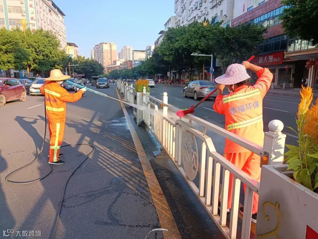 4、机械与人工相结合对马路中间护栏进行冲洗。