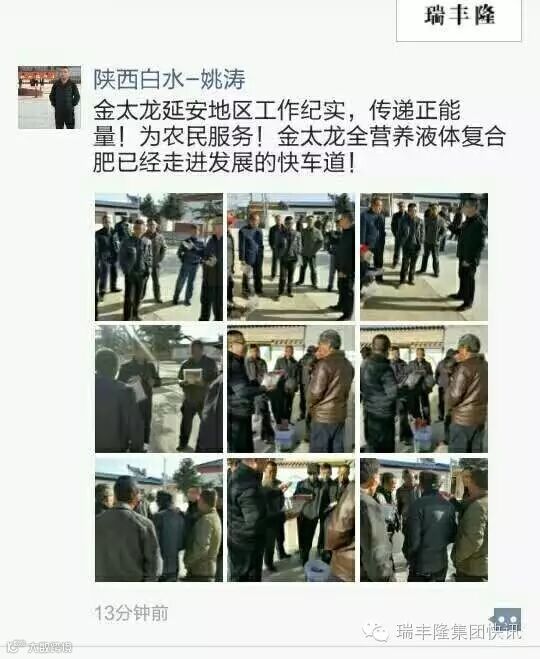 业界流传一句话:旺季做商品,淡季做服务;旺季做销售,淡季做形象。侧重点不同,实际意思是一样的——只有淡季的思想,没有淡季的市场。昨日,金太龙陕西分公司发回图片:延安地区业务负责人姚涛经理,在这个的销售淡季,深入市场修炼内功,加大产品宣传,提高销售技巧,提升服务水平。金太龙全营养液体复合肥已经走进发展的快车道——传递正能量!