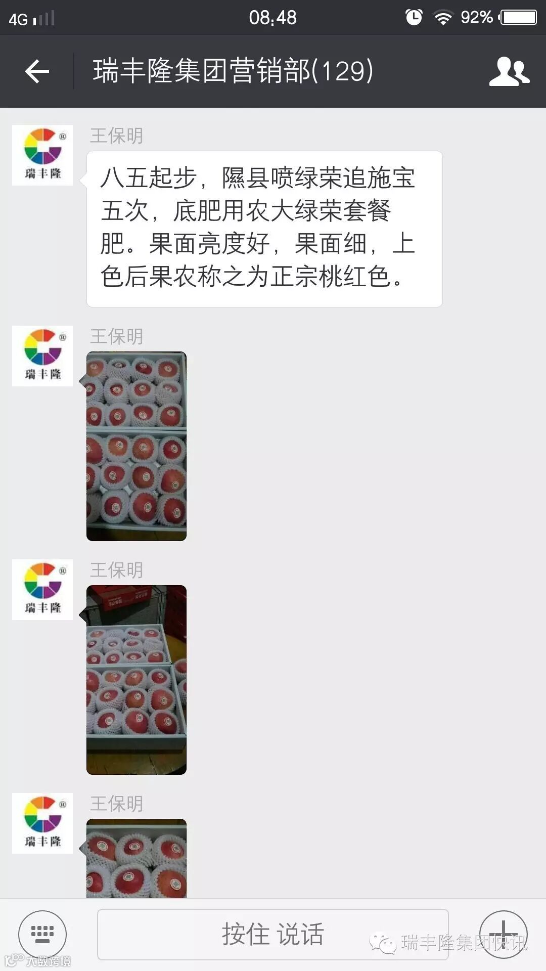 瑞丰隆集团快讯山西临汾隰县种植户根据当地土壤和种植特点,依照山西农大专家的建议,底肥使用山西农大绿荣套餐肥,叶面喷施使用绿荣追施宝超浓缩液体肥5次后,苹果喜获丰收。从图中可以看到:苹果不仅个头大,基本都是八五起步,而且果面亮度好,果面细,上色后果农称之为“正宗桃红色”。山西农大绿荣推出的底肥液肥这个双轮驱动组合,受到山西本土老百姓的热烈欢迎。既有山西农大绿荣这个品牌的保证,同时测土配肥和定期的专家对接讲解,更是让许多种植用户受益匪浅!
