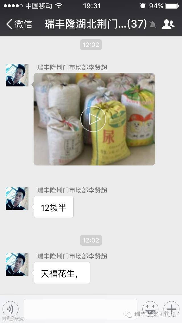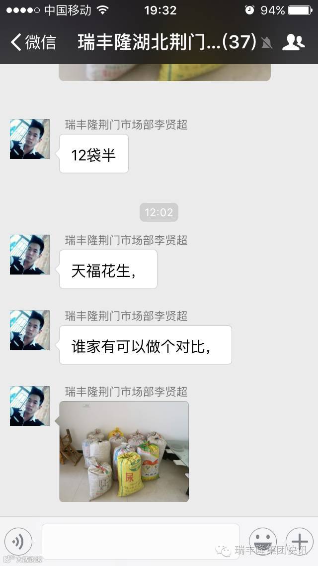 昨日,瑞丰隆湖北荆门市场部李贤超在自家地里试验示范的花生喜获丰收。今年初李经理刚刚接触瑞丰隆液体喷施肥时,正好自己家的花生田准备追肥,靠着对瑞丰隆叶面喷施替代根部追肥的新技术新理念的认可,他在自家一亩地的花生上使用瑞丰隆液体喷施肥追肥2次,现在花生丰收了,晒干后测量的结果让所有人大吃一惊:刚才满满一车的花生现在变成满满一地袋子的花生!李经理给花生装袋,一共装了12袋半!