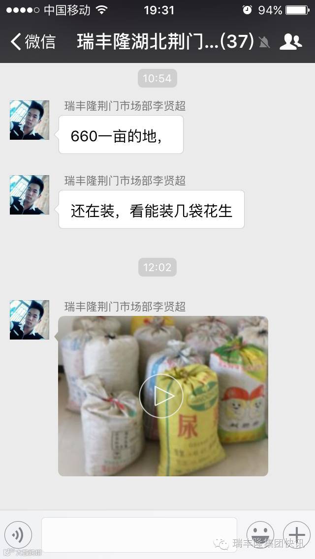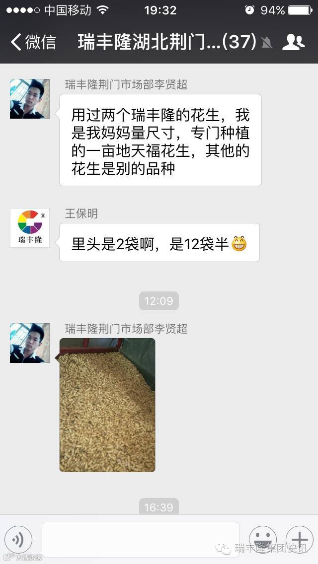 瑞丰隆集团快讯昨日,瑞丰隆湖北荆门市场部李贤超在自家地里试验示范的花生喜获丰收。今年初李经理刚刚接触瑞丰隆液体喷施肥时,正好自己家的花生田准备追肥,靠着对瑞丰隆叶面喷施替代根部追肥的新技术新理念的认可,他在自家一亩地的花生上使用瑞丰隆液体喷施肥追肥2次,现在花生丰收了,晒干后测量的结果让所有人大吃一惊:刚才满满一车的花生现在变成满满一地袋子的花生!李经理给花生装袋,一共装了12袋半!