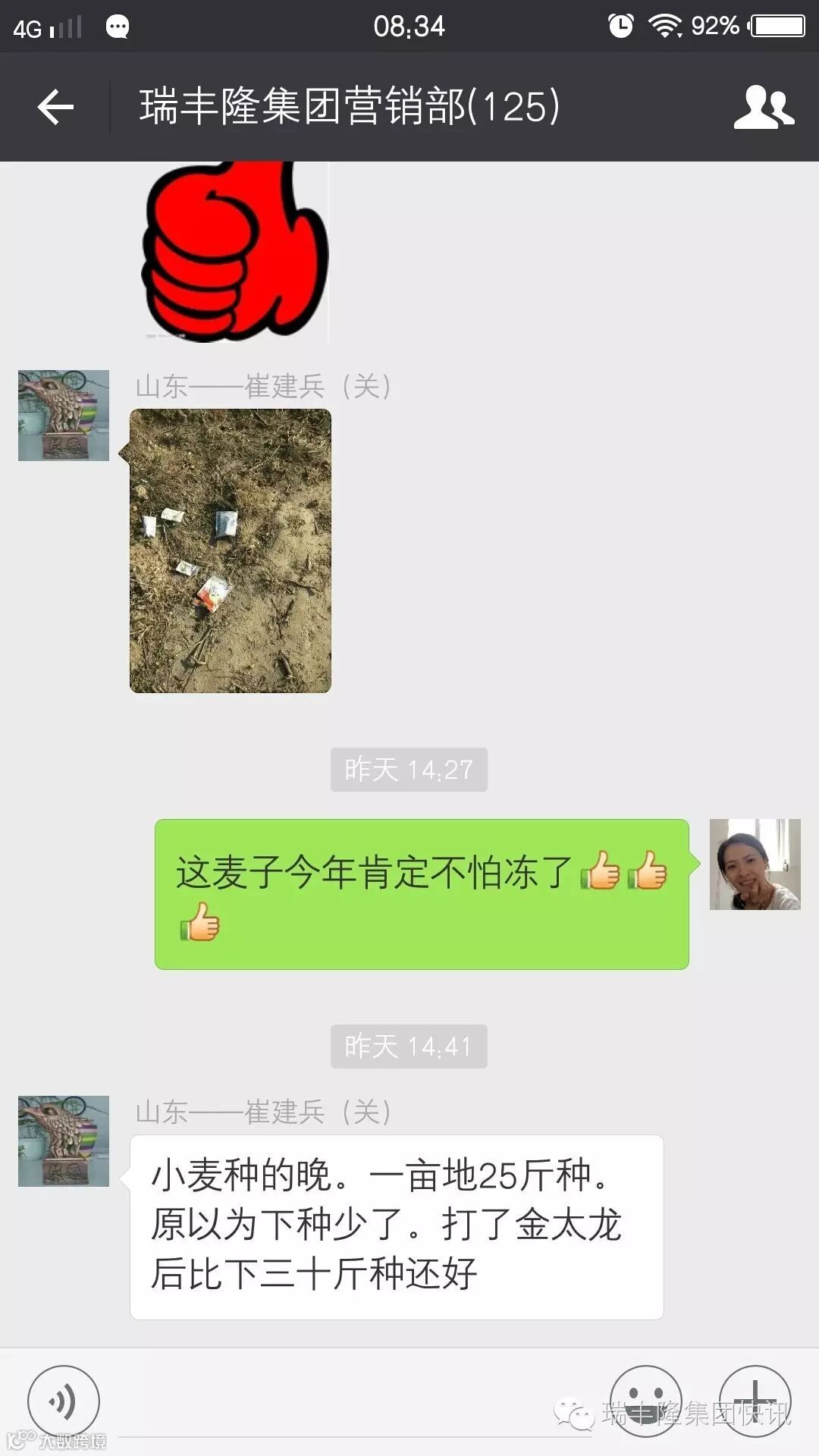 瑞丰隆集团快讯昨日金太龙山东地区负责人崔建兵经理传回当地使用金太龙的小麦图片,麦子黑绿黑绿的,出苗率高。据崔经理讲:这片小麦种的晚,一亩地只下了25斤种子,当时用户还担心种子下的太少了怕出苗不行,于是追施了金太龙追肥宝,现在看起来比别人下30斤种子的麦子长得还好!这就是金太龙追肥宝查缺补漏神奇之处——金太龙追肥宝在小麦生育前期能促早发壮苗,随着冬季的来临,促进低位分蘖的发育,特别是对冬前拔节的旺长苗,镇压可以促使旺苗向壮苗转化,增加抵抗逆境的能力。促进分蘖生成,提高根系发育,培育壮苗,增强抗冻性。