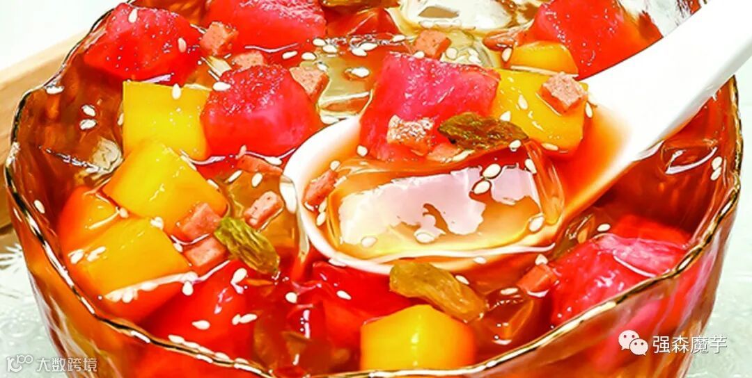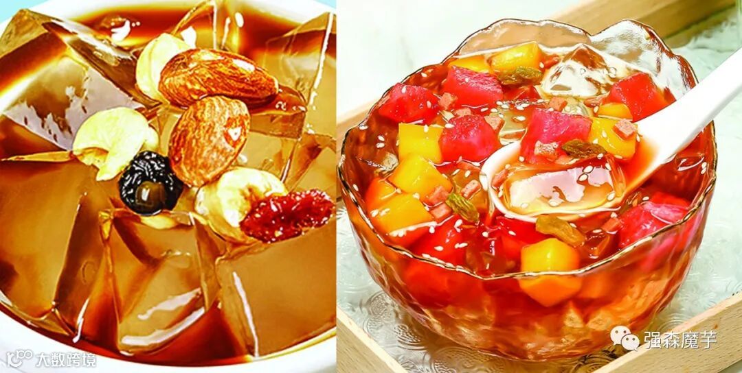 第三步,根据自己的喜好,准备一些新鲜水果切成小块。或者把坚果简单切碎,又或者直接准备一些红糖水,或者蜂蜜水。然后把冰凉粉取出来,切成大块,倒入刚才准备好的各种配料,简单搅拌一下就可以吃了。