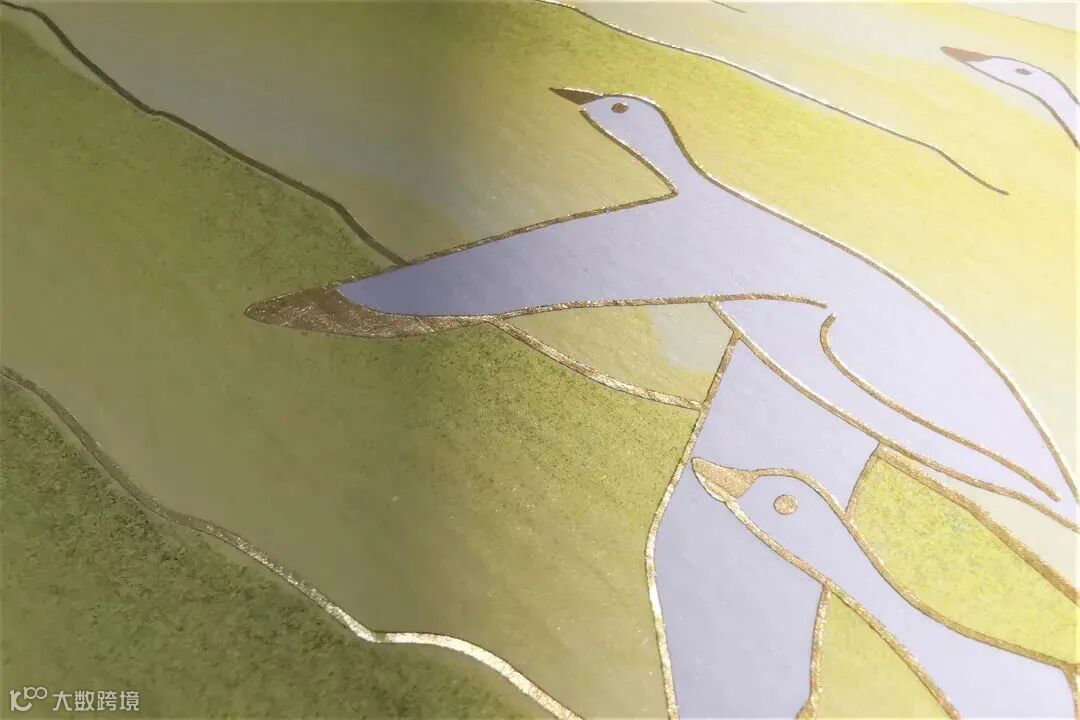 纸张选用复古又鲜明的色彩,搭配不同颜色的丝线纤维(白、金、银),二者的完美结合,赋予了纸张浓烈的东方韵味,纸张华贵,看似不规则的飘丝,其实自有条理,尽显大气。