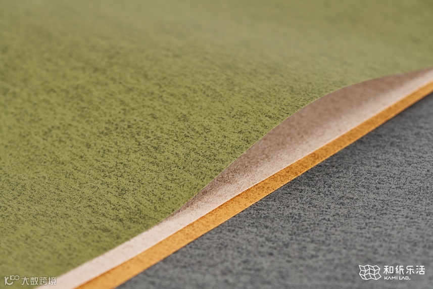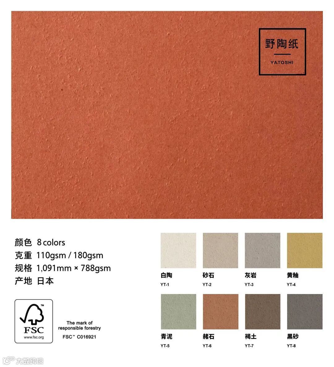 野陶纸选取富有自然野趣的原石色调,将返璞归真的生活态度融入生活。为表现出古陶温厚朴实的质感,自然恬淡的气质,设计师在纸张中间层添加了特殊纤维,形成纸张表面视觉上粗颗粒的效果,触摸着粗粝、不平滑的肌理时心中却产生亲近之情。