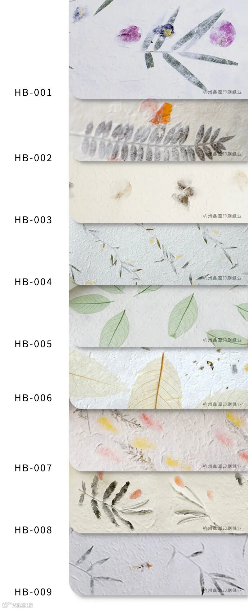 叶纸是将自然飘落的叶子回收、晒干、压碎,采用传统手工造纸方法,制纸时加入了较多的植物长纤维,因此纸张韧性较强,表面碎叶自然流露,别样素雅的韵味跃然纸上。