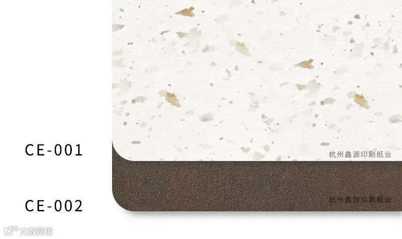 CE-001_再生咖啡是一款由 95%的 PCW 再生纤维和 5%的咖啡豆皮制成的纸,表面呈现咖啡色原生态花纹,深邃的天然肌理加其舒适的手感。CE-002咖啡纸利用咖啡残渣替代高达 15% 的原生树浆制成,采用 EKOenergy 生产,不含转基因成分,生产过程和产品均受欧洲专利保护。