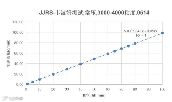 2. 输送5000-6000cP卡波姆:在流量1-100mL/min内,JJRS-30008S能够输送;当输送流量>65mL/min时出口处存在抖动,虽然天平结果不受影响,但建议输送流量<65mL/min。
