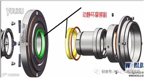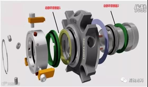 机械密封(也称端面密封)是一种用来解决旋转轴和机体之间的密封装置,它是由至少一对垂直于旋转轴线的端面,在流体压力和补偿机构弹力的作用及辅助密封的配合下,保持贴合并相对滑动而构成防止流体泄漏的装置,常用于机泵、压缩机等旋转式流体机械。机械密封的基本元件由动环、静环、压盖、推环、弹簧、定位环、轴套、辅助密封(动静环密封圈、轴套密封圈)组成。
