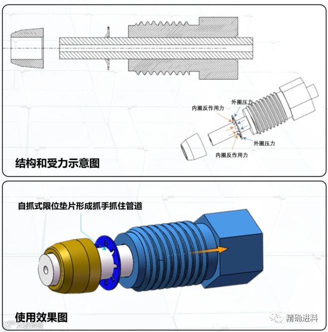在管道的连接上,精进科技开发了自主知识产权的反向压力自锁紧卡套接头连接结构,利用自抓实限位垫片,反向抓住管道,与杭州精进科技的四氟管联用,可以使管道的耐压提高到10MPa以上。