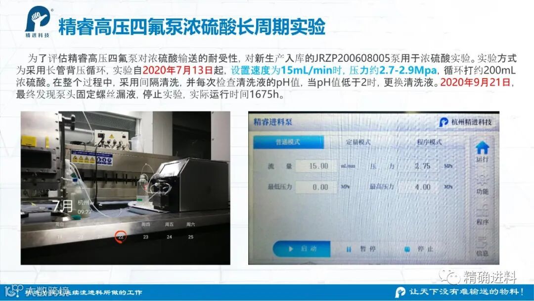基于上述条件,杭州精进科技研发了一款既耐高压又耐腐蚀的进料泵,泵头结构为不锈钢内嵌PTFE,适用于更多的强腐蚀应用场合。管道采用PTFE管,连接部位在传统卡套接头的基础上引入自抓式限位垫片,利用卡套接头空心螺钉接触面配合改性塑料卡套形成作用外圈的压力和内圈的反作用抓力,耐压性能显著提升。浓硫酸长周期实验证明,在输送压力为2.7-2.9MPa时,精睿高压四氟泵能够连续输送浓硫酸1675h。