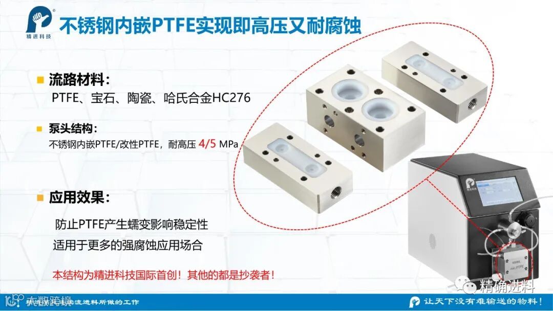 目前微反应领域采用的不锈钢进料泵耐高压,但耐腐蚀性较差。腐蚀性液体输送使用最为广泛的为氟塑料制造的耐腐蚀泵,其中四氟泵应用最为广泛,耐腐蚀性好,但耐压性有限,不能适用于高压反应。连续流进料对于泵除了耐腐蚀外还要同时满足一些特殊要求,如需要稳定无脉冲、适用于不同粘度和温度的物料、耐压、适用于易气化物质、精准输送等。