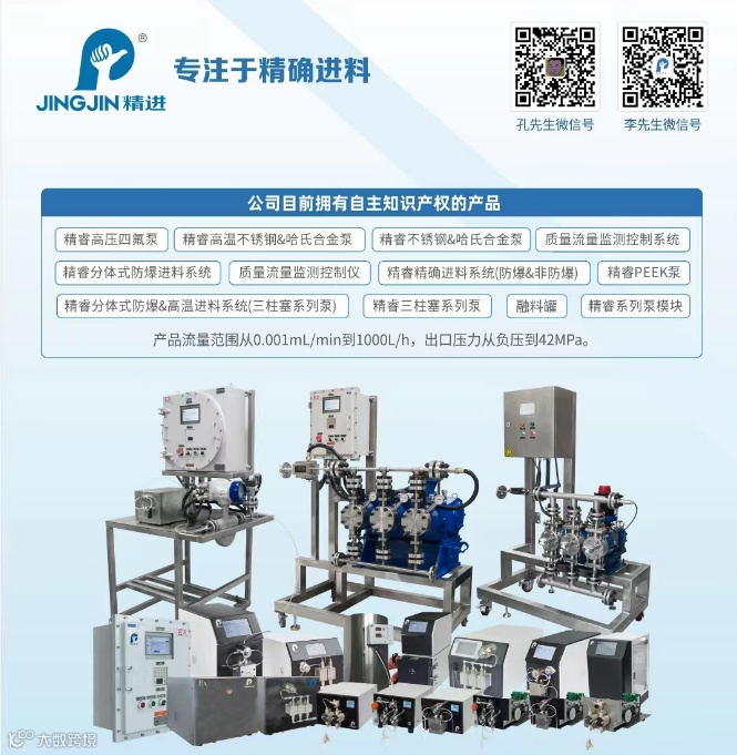 产品系列分别为:精睿高压四氟泵/不锈钢泵/哈氏合金泵、精睿高温不锈钢/哈氏合金泵、质量流量监测控制仪、精睿分体式防爆进料系统、精睿精确进料系统(316L、不锈钢衬PTFE、不锈钢衬PVDF;防爆、非防爆)、精睿三柱塞泵(316L&哈氏合金、防爆&非防爆、高温&常温)、精睿小屏版(316L、四氟、C276)等。