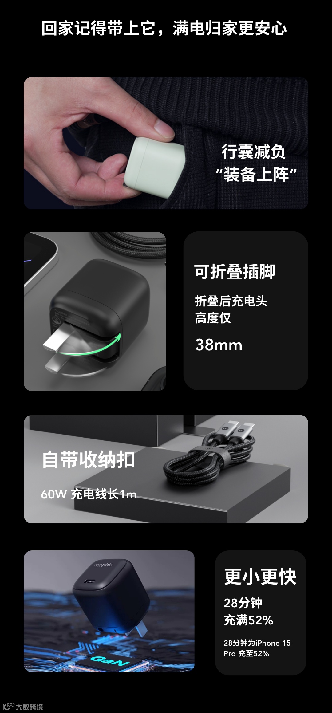 30W PD快充+60W稳定高效数据线组合,充电速度飞快,效率提升显著。从手机到平板再到耳机,出发前快速满电,再也不用担心途中断电的尴尬。mophie不仅是充电器,更是你旅途中的“时间管理大师”。