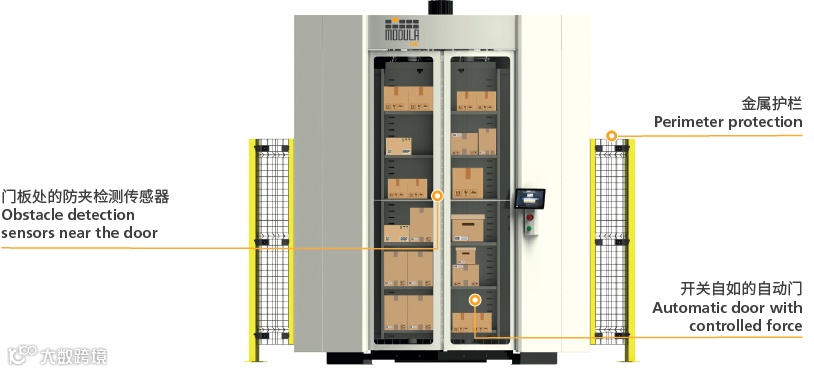 自动门,在货柜运转时保持关闭状态;只有货柜完全静止时,拣选状态就绪后,自动门才会打开。门板由高强度的聚碳酸酯制成,采用半弯曲设计,符合人体工程学要求,便于操作人员进行拣选作业。自动门还配有传感器,以防止门在关闭过程中受到人员或者物体的干扰。关门的力度也经过了校准,以防止挤压事故的发生。