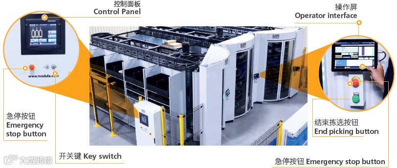 • 每组货柜还配有一个结束拣选按钮和一个急停按钮。