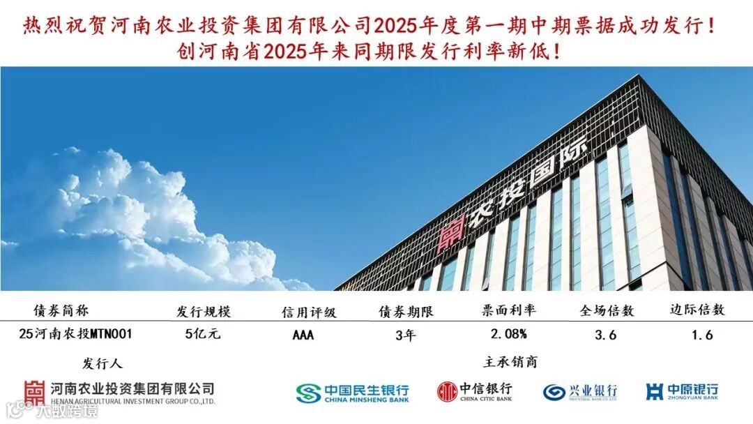 3月25日,河南农投集团在银行间债券市场成功发行2025年度第一期中期票据。本次发行规模5亿元,债券期限3年,票面利率2.08%,创河南省同期限债券利率新低。本期债券由民生银行担任主承销商,兴业银行、中信银行、中原银行作为联席承销商,发行过程中获得了市场投资者的踊跃认购,全场认购倍数达3.6倍,充分彰显了资本市场对河南农投集团综合实力与发展前景的高度认可。