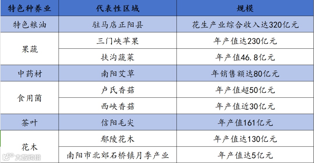 详细来看,特色粮油以驻马店正阳县为代表,果蔬以三门峡苹果、周口扶沟蔬菜为代表,中药材以南阳艾草产业为代表,食用菌以卢氏和西峡香菇为代表,茶叶以信阳毛尖为代表,花木以鄢陵县花木产业、南阳市北郊石桥镇月季产业为代表,牛羊以柘城肉牛、黄河滩羊等为代表性产品,特种畜禽以济源肉兔和武陟肉鸭为代表,水产品养殖在新乡、商丘、信阳、濮阳等多地均有分布,产品覆盖蟹、虾、鲈鱼、金鱼等多个品类。