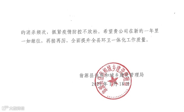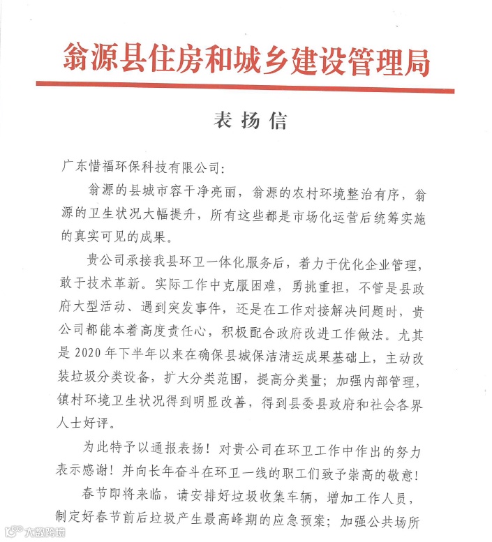 1、感谢县住建局对我司这几年来工作给予肯定,我们会在今后工作中总结经验,完善工作,为洁净的翁源贡献力量。