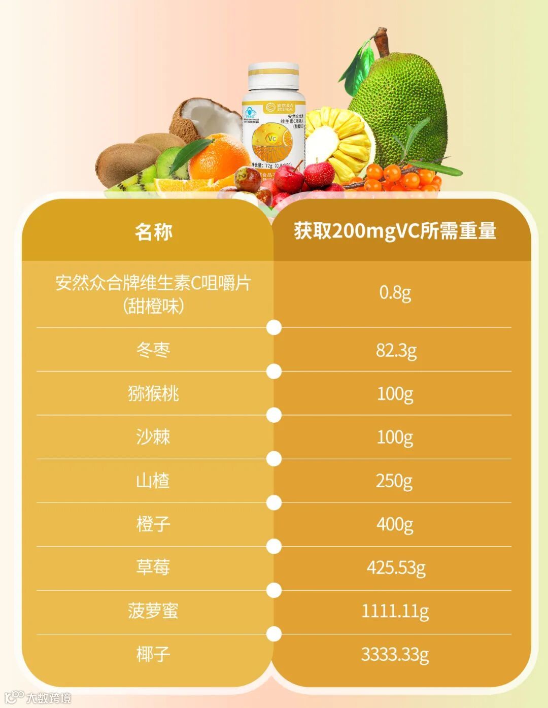 安然众合牌维生素C咀嚼片(甜橙味)1片仅为0.8g,和其他能获得200mgVC的蔬菜水果根本不是一个量级。