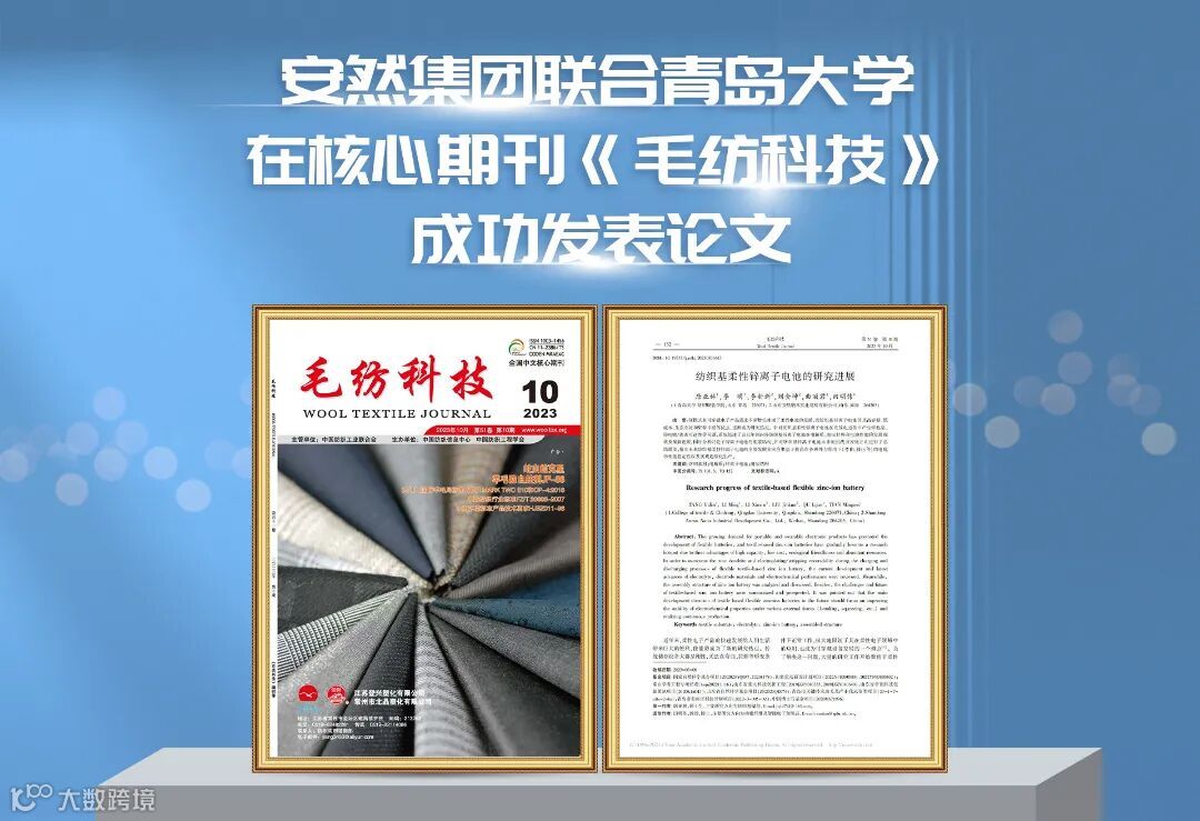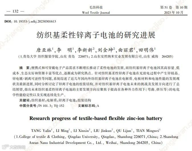近日,安然集团联合青岛大学在《毛纺科技》(2023年10月第51卷第10期)成功发表题为《纺织基柔性锌离子电池的研究进展》的论文。