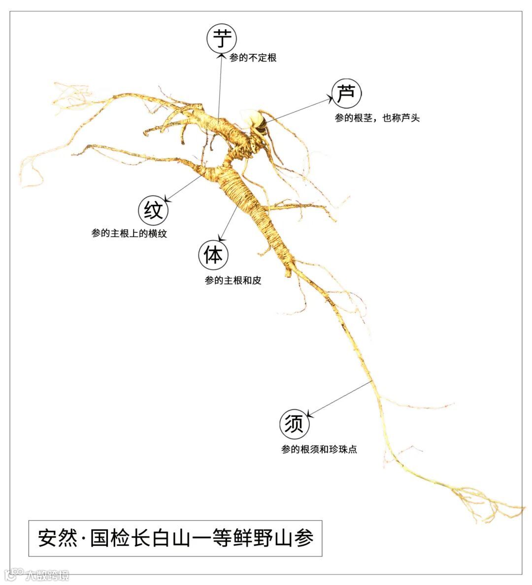 这就是参命源50人参饮品的参源母本,能清晰地看到它的芦碗,有马牙芦和圆芦,芦碗密集程度高,皮老色暗,遍布细密的“螺旋纹”,根须上随处可见珍珠点,整体形似一个挥舞手臂奔跑的人。