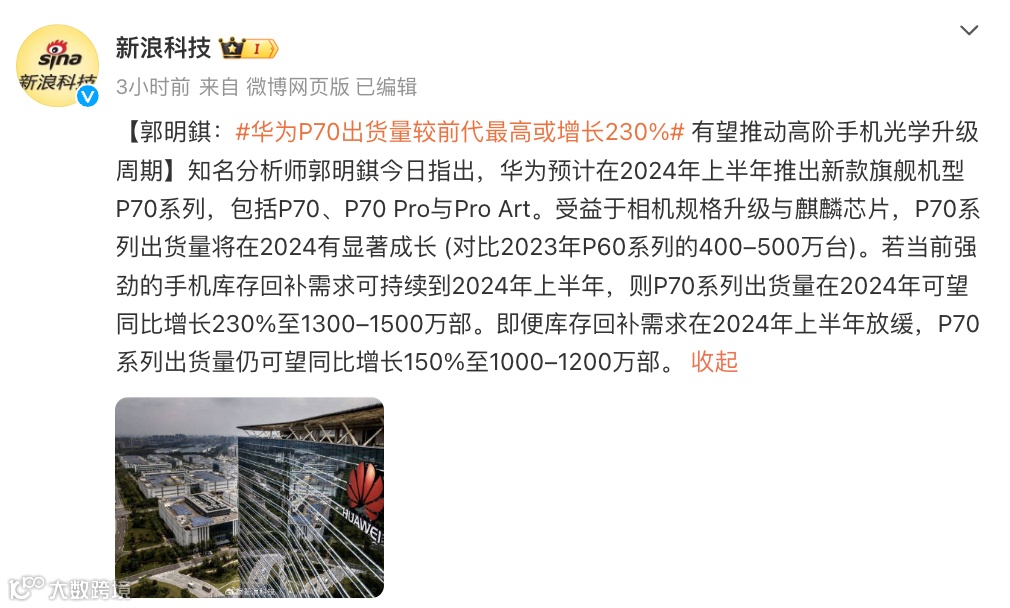 另外,新浪科技此前的一份报道显示:“若当前强劲的手机库存回补需求可持续到2024年上半年,则P70系列出货量在2024年可望同比增长230%至1300–1500万部。即便库存回补需求在2024年上半年放缓,P70系列出货量仍可望同比增长150%至1000–1200万部。”