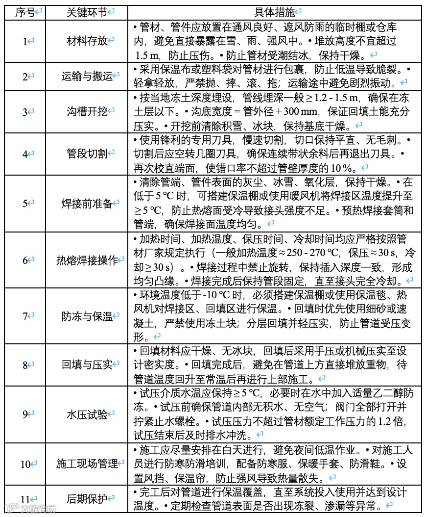 保温措施是关键:在‑10 ℃ 以下必须采用保温棚、热风机或保温毯等手段,保证焊接区、回填区温度不低于 5 ℃,防止热熔接头因冷却过快而产生弱点。