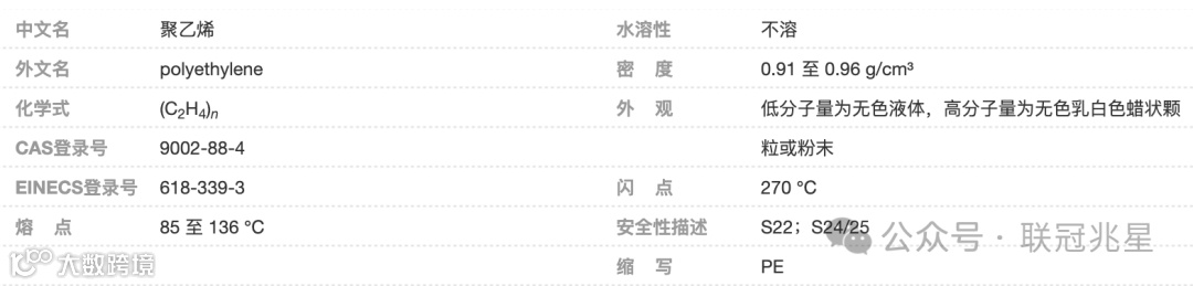 性质:无味、无臭、无毒、表面无光泽、乳白色蜡状颗粒,密度约0.920 g/cm3,熔点108℃~126℃。不溶于水,微溶于烃类等。能耐大多数酸碱的侵蚀,吸水性小,在低温时仍能保持柔软性,电绝缘性高。