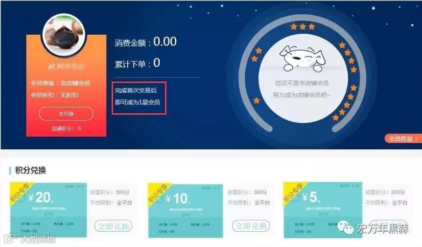 首先关注公众号宏万年黑蒜,进入购买专区-店铺详情-店铺会员-积分兑换