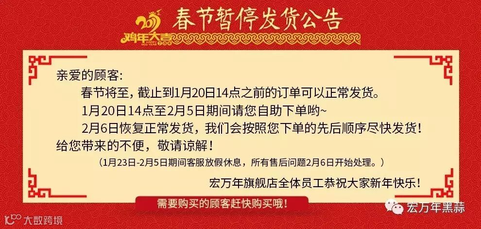 春节将至,快递哥哥们马上就要休息了,走亲访友的礼品您都备齐了吗?宏万年旗舰店将于1.20日全面停发快递,还要充盈年货的您可得抓紧了哦!!