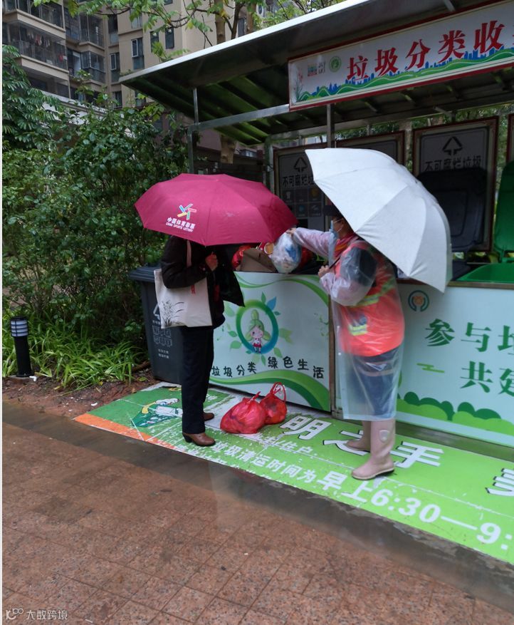 各分类劝导员在各主要路段和各试点小区守点宣传干湿垃圾、废弃口罩分类投放及破袋分类厨余垃圾。