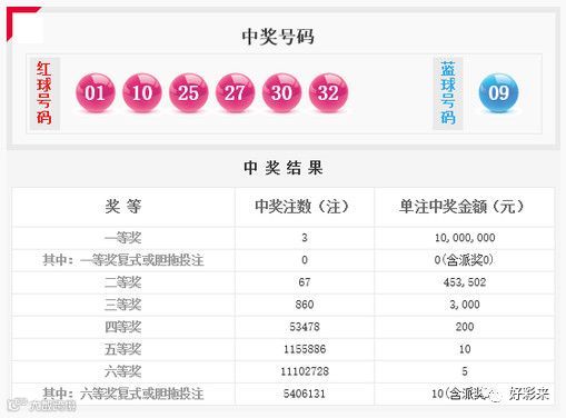 当期红球号码大小比为4:2,三区比为2:0:4;奇偶比为3:3。其中,红球开出三枚隔码10、25、27;一枚斜连号10;一组奇连号25、27;一组偶连号30、32;蓝球则开出09