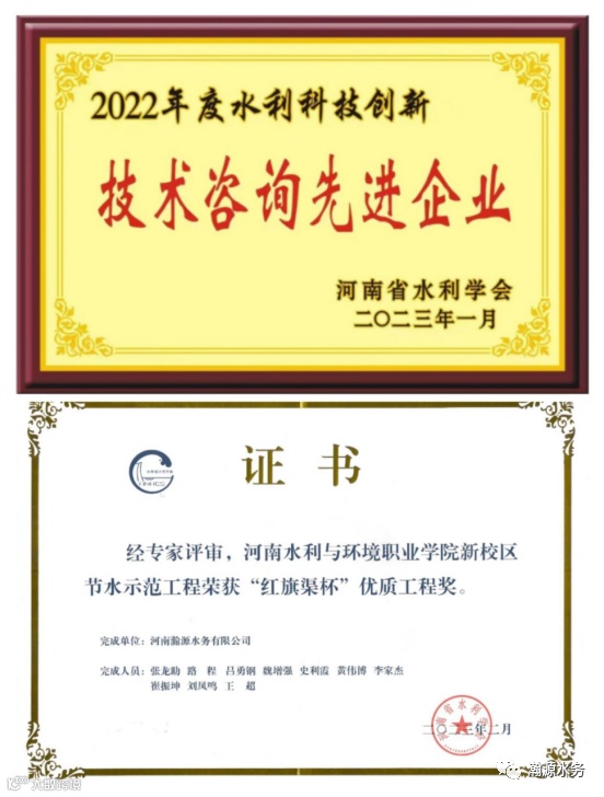 会上颁发了河南省水利学会工作先进集体奖、水利科技创新先进企业奖、水利建设“红旗渠杯”优质工程奖。我司荣获“技术咨询先进企业”荣誉称号、建设施工的“河南水利与环境职业学院新校区节水示范工程”荣获“红旗渠杯”优质工程奖。