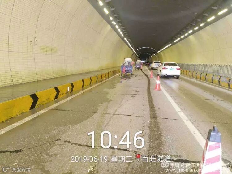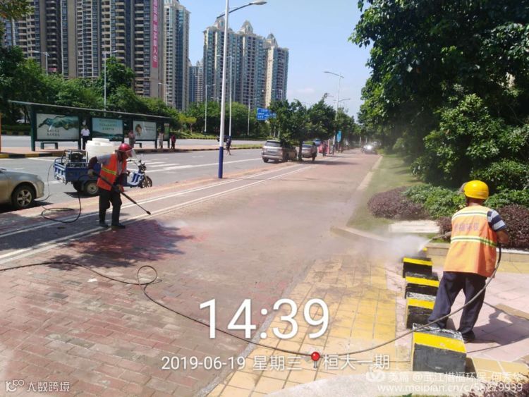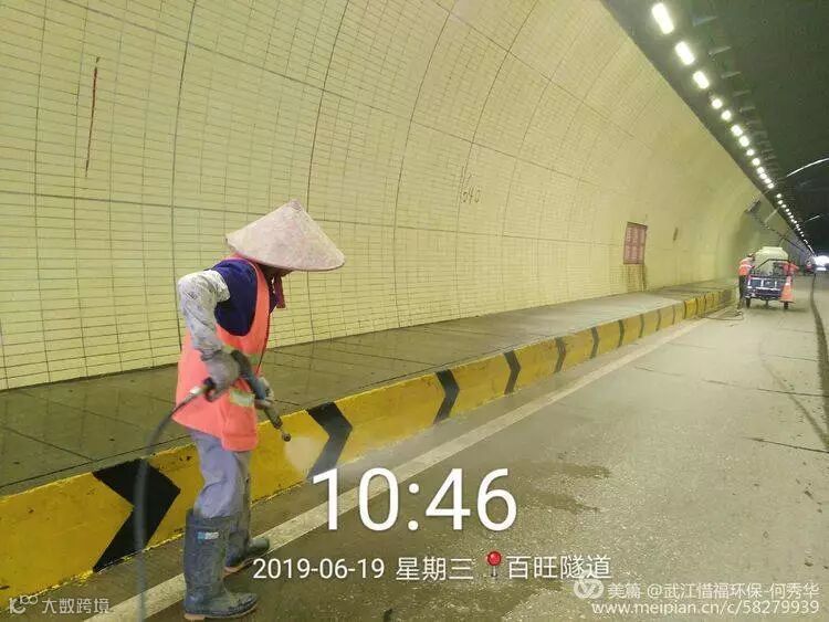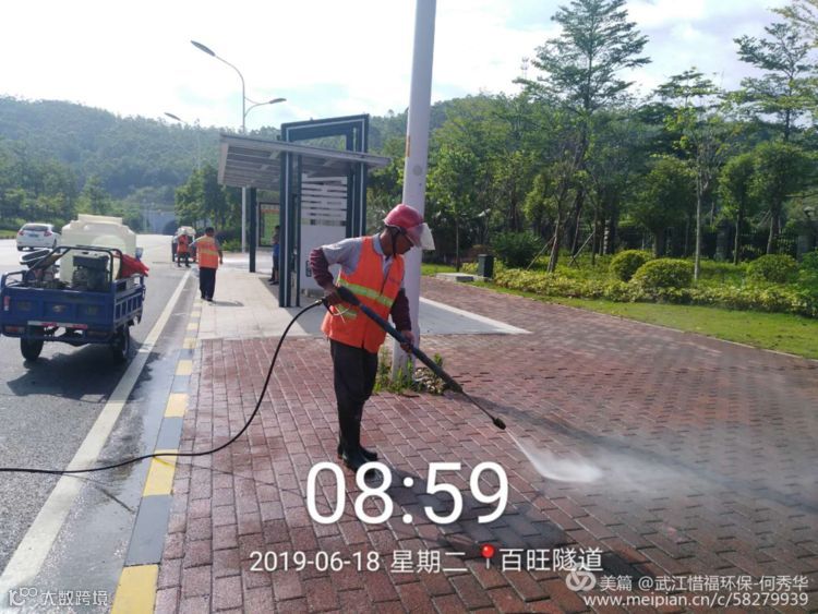 高压清洗队冲洗百旺隧道,公交车站、人行道