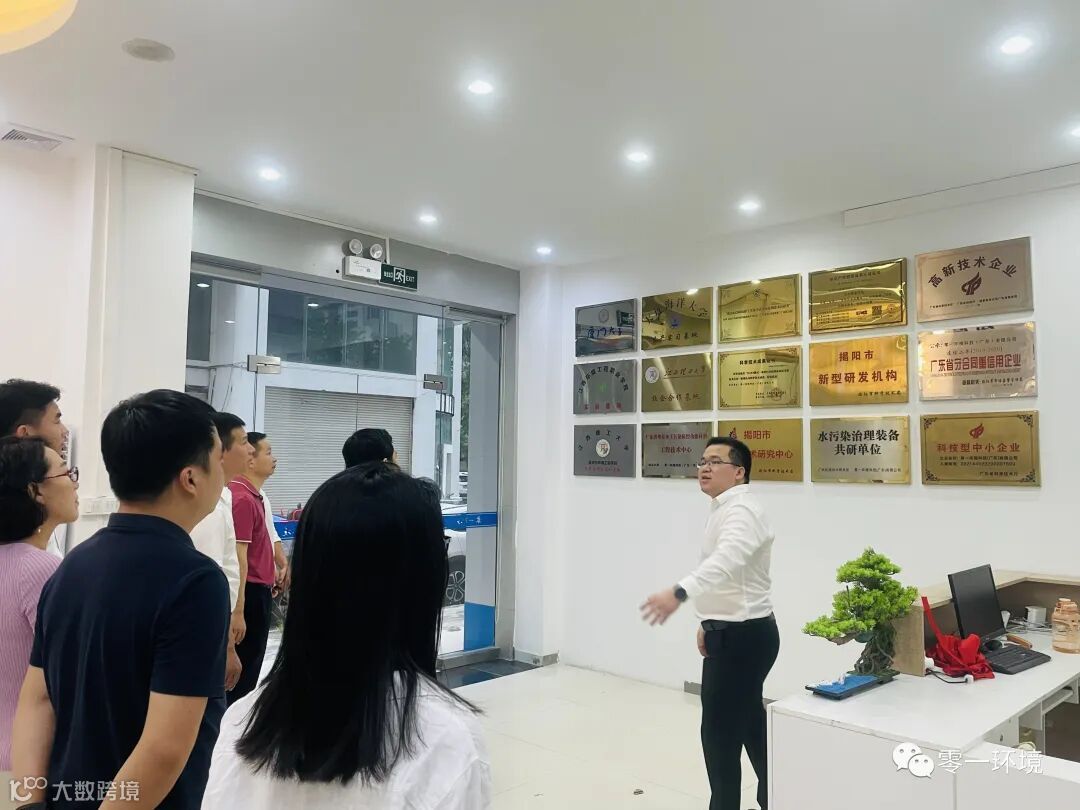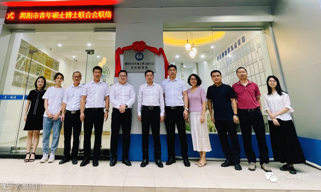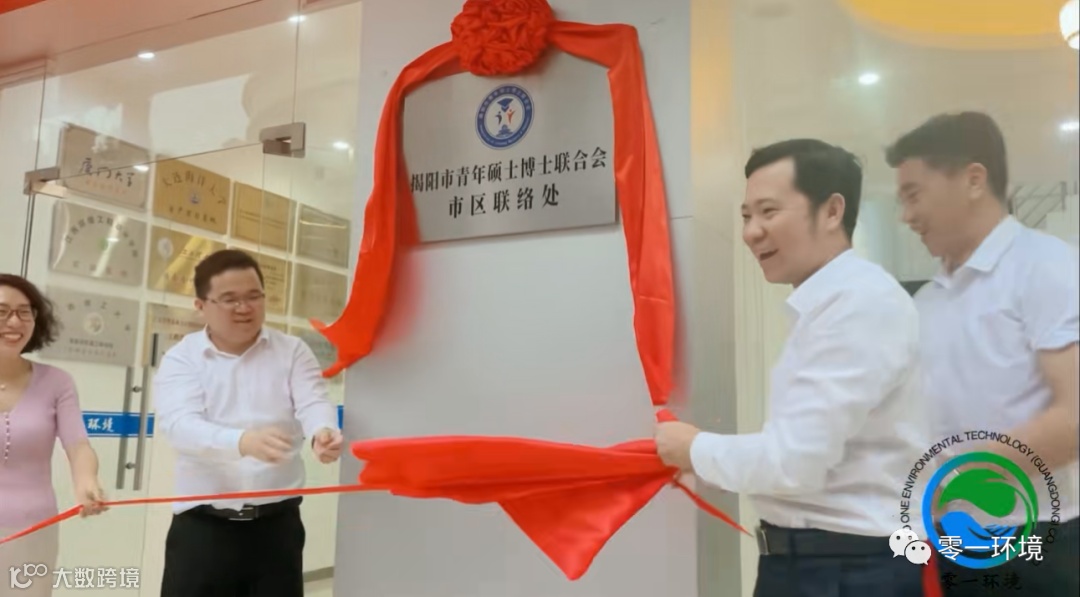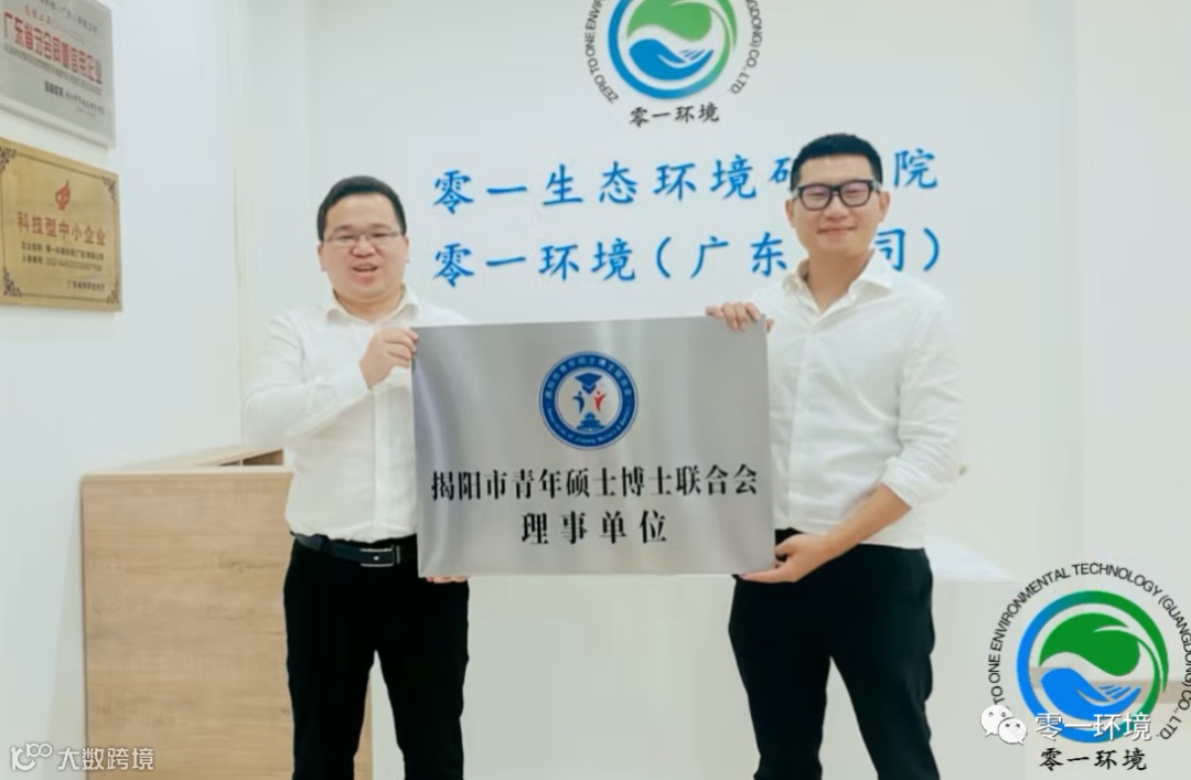 图为揭阳市青年硕士博士联合会会长洪宇聪博士授予零一环境科技(广东)有限公司“揭阳市青年硕士博士联合会理事单位”牌匾