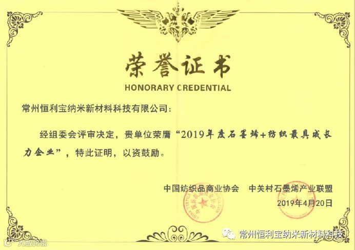 2019年4月20日,2019石墨烯赋能纺织产业创新发展论坛在上海新国际博览中心举行,此次论坛邀请了数十位行业知名专家、领军企业代表针对石墨烯及新型功能纤维材料在智能服饰、家纺、大健康等领域的应用技术展开交流,深圳烯旺,上海烯望,济南圣泉,东丽纤维,上海纺智,常州恒利宝,强生石墨烯等上百家石墨烯领域知名企业也参会参展。在论坛中,中关村石墨烯产业联盟联合中国纺织品商业协会在论坛中开展了中国纺织新材料应用表彰评选活动,评选出行业内成长潜力最为卓越的企业、树立成长性企业标杆,促进石墨烯在纺织行业的示范应用,经过评委和专家的层层筛选,我司最终荣获“2019年度石墨烯+纺织最具成长力度企业”。