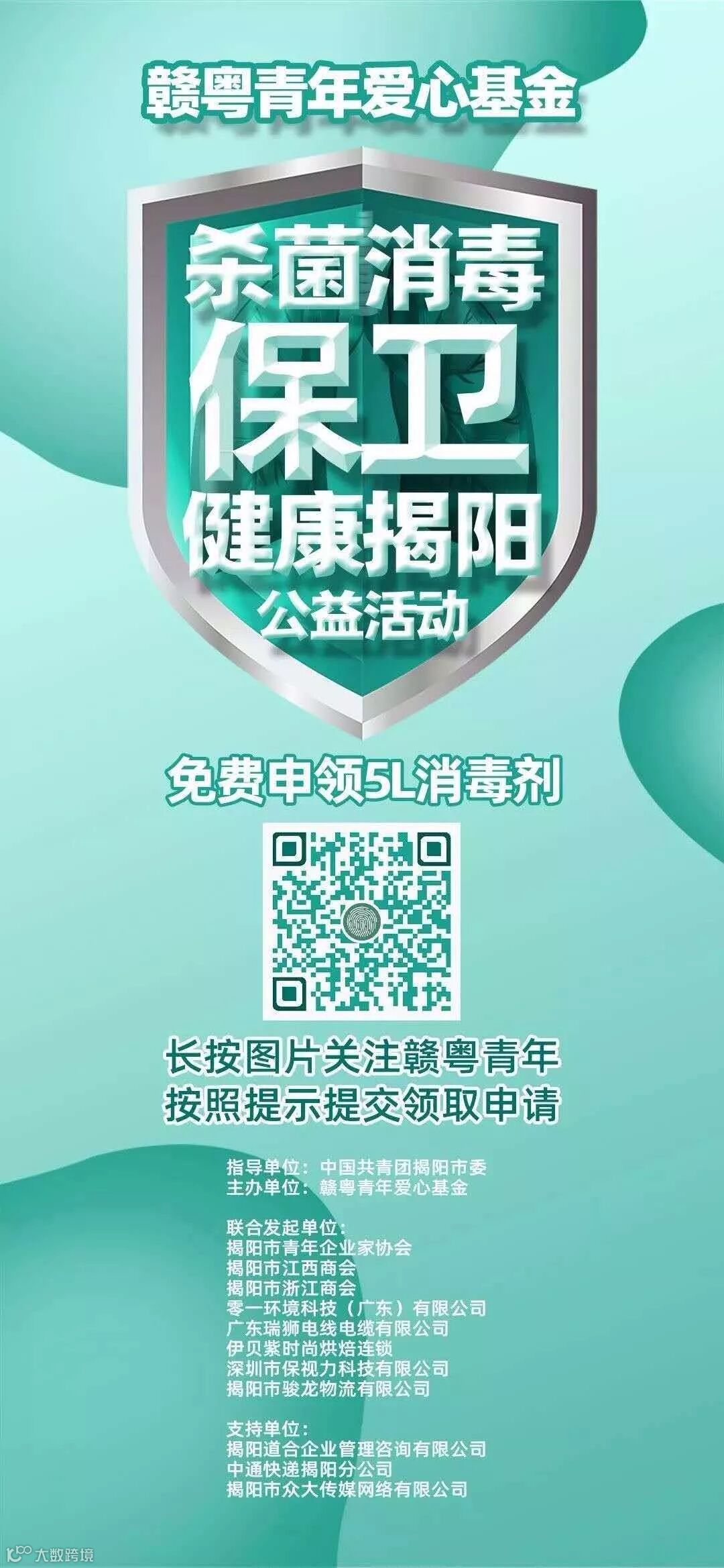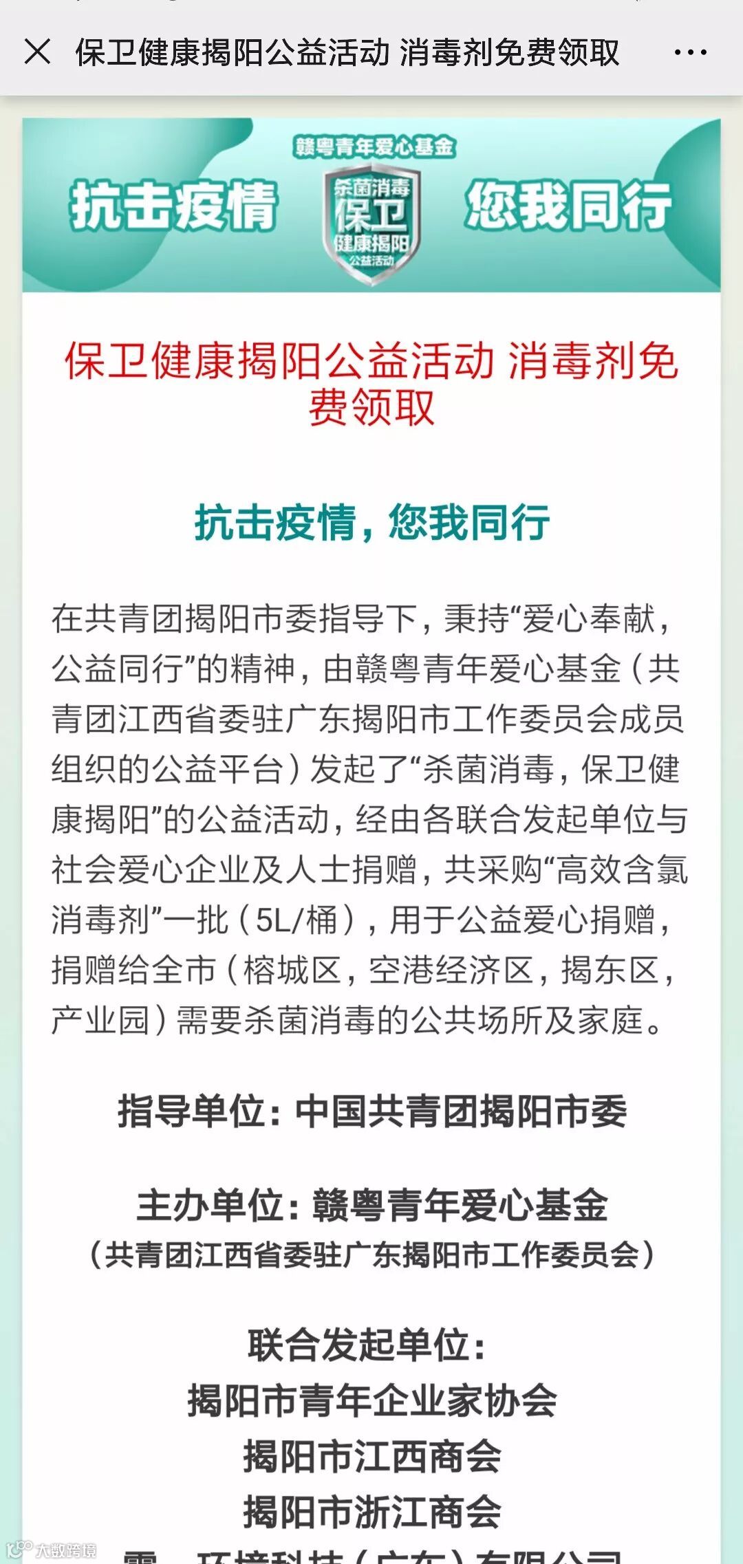 在共青团揭阳市委员会的指导下,秉承“爱心奉献,公益同行”的精神 ,由赣粤青年爱心基金(共青团江西省委驻广东揭阳市工作委员会成员组织的公益平台)发起了“杀菌消毒,保卫健康揭阳”的公益活动,经由各联合发起单位与社会爱心企业及人士捐赠,共采购“高效含氯消毒剂”一批(5L/桶),用于公益爱心捐赠,捐赠给全市(榕城区,空港经济区,揭东区,产业园)需要杀菌消毒的公共场所及家庭。
