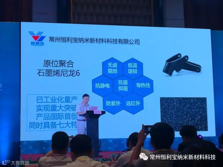 常州恒利宝纳米新材料科技有限公司的原位聚合石墨烯尼龙6在大会中被提出,产品的特性主要有:无卤阻燃性、抗静电性、抗菌抑菌性、超高导热性、良好的低温远红外功能、优越的抗紫外线功能等。同时在民用丝和工业丝领域有重大发展前景。