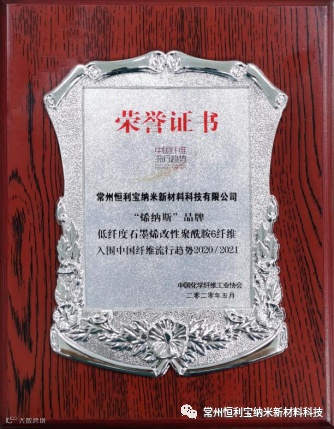 2020年5月常州恒利宝纳米新材料科技有限公司旗下“烯纳斯”品牌中的低纤度石墨烯改性聚酰胺6纤维入选2020-2021年中国纤维流行趋势。
