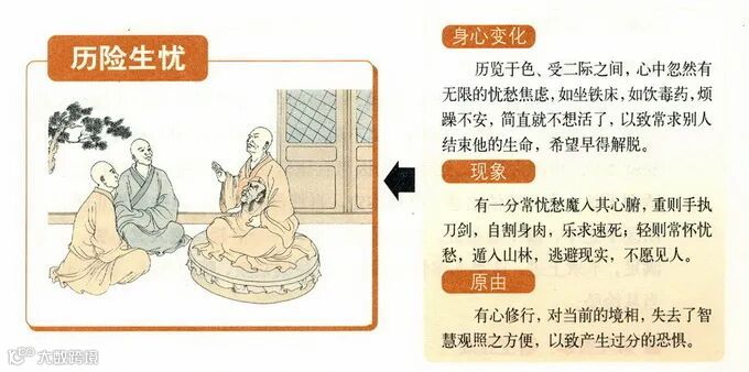 “又修禅定中的诸善男子,见色阴消尽,受阴明白显露;当此之际,受阴显现,但是不能发大自在用,所证还未获大自在用。而色阴已经破尽了,因此历览前后两际茫茫无寄,无所适从,这样的一个中间的过程,心自生进退维艰,突然间感到一种不知如何是好,莫名恐怖的心出现,而且这恐怖中夹带了一种无穷无尽的忧愁。眠则如坐铁床(睡不安枕),食则如饮毒药(食不甘味)。对整个生命完全失去了希望,所求圣道又仍无着落,心不欲活,恨不速死为快,常求别人来夺取他的生命,认为早死就能早解脱。”