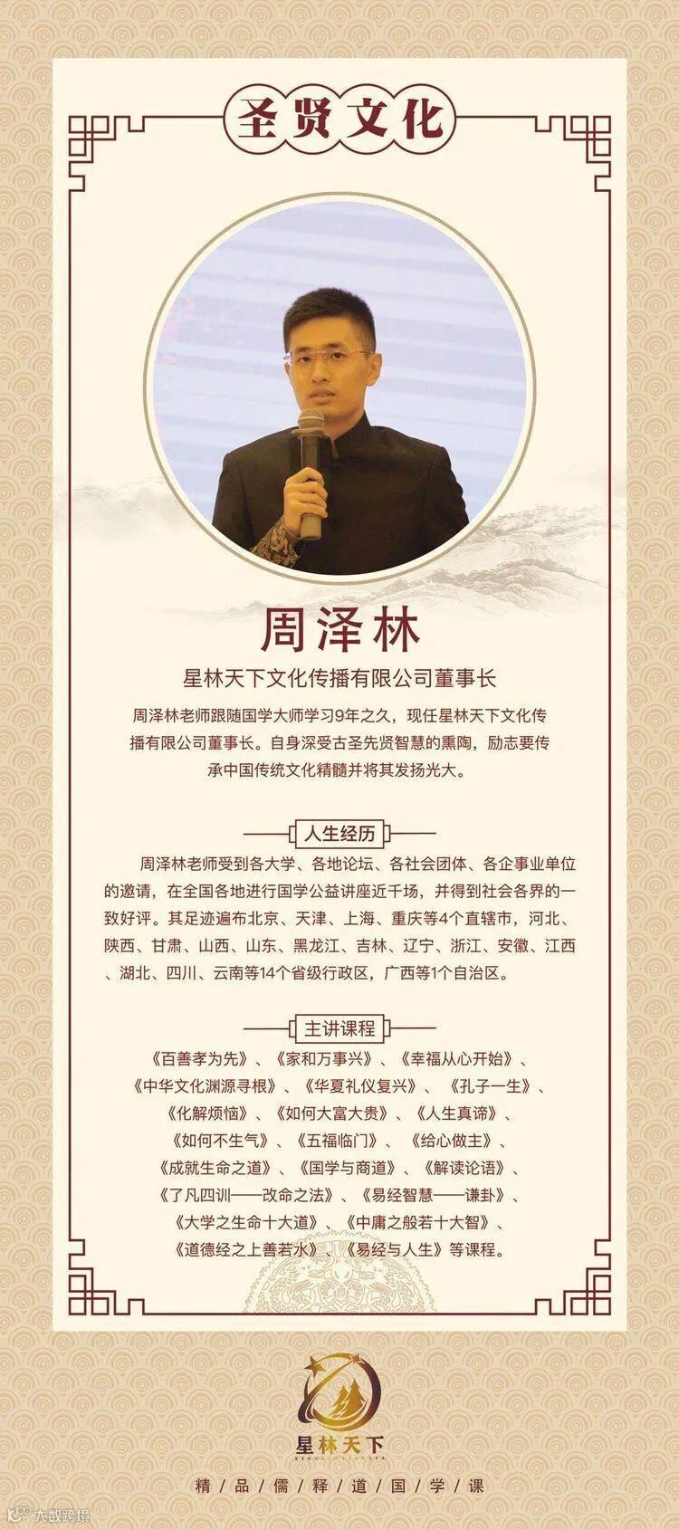 星林天下是由李星莹老师、周泽林老师携手共创的品牌,品牌以弘扬圣贤文化为主要任务。