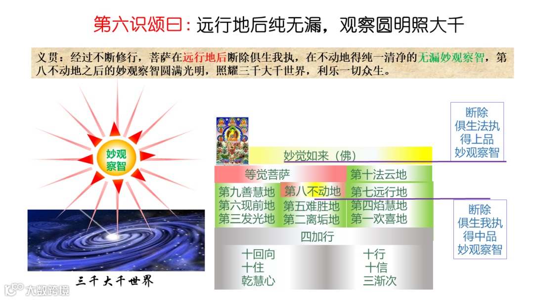 当第七意识初分转成平等性智的时候,第六意识也初分转成妙观察智──断分别我法二执,发起下品妙观察智;八地──俱生我执断,转下品为中品妙观察智;等觉──俱生法执断,中品转为上品妙观察智。